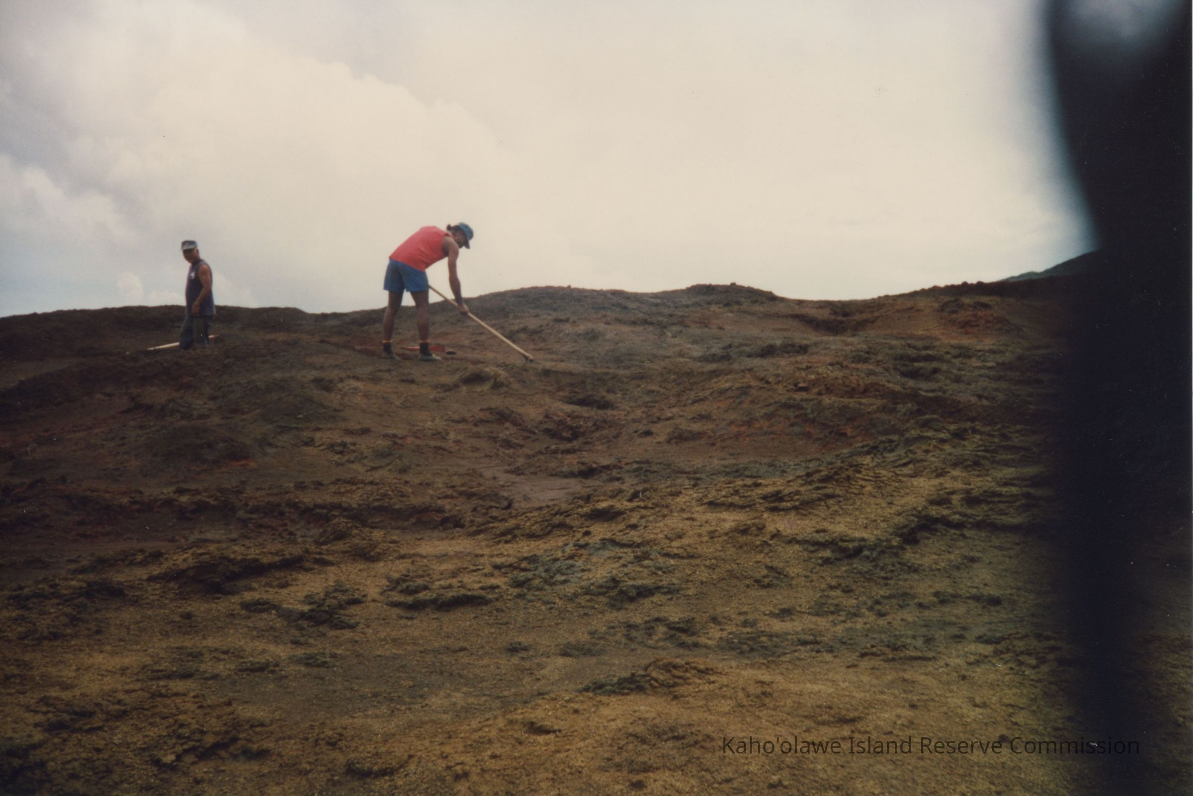 Two individuals are working on a rugged, hardpan terrain under an overcast sky, using tools for digging the dry, uneven ground.