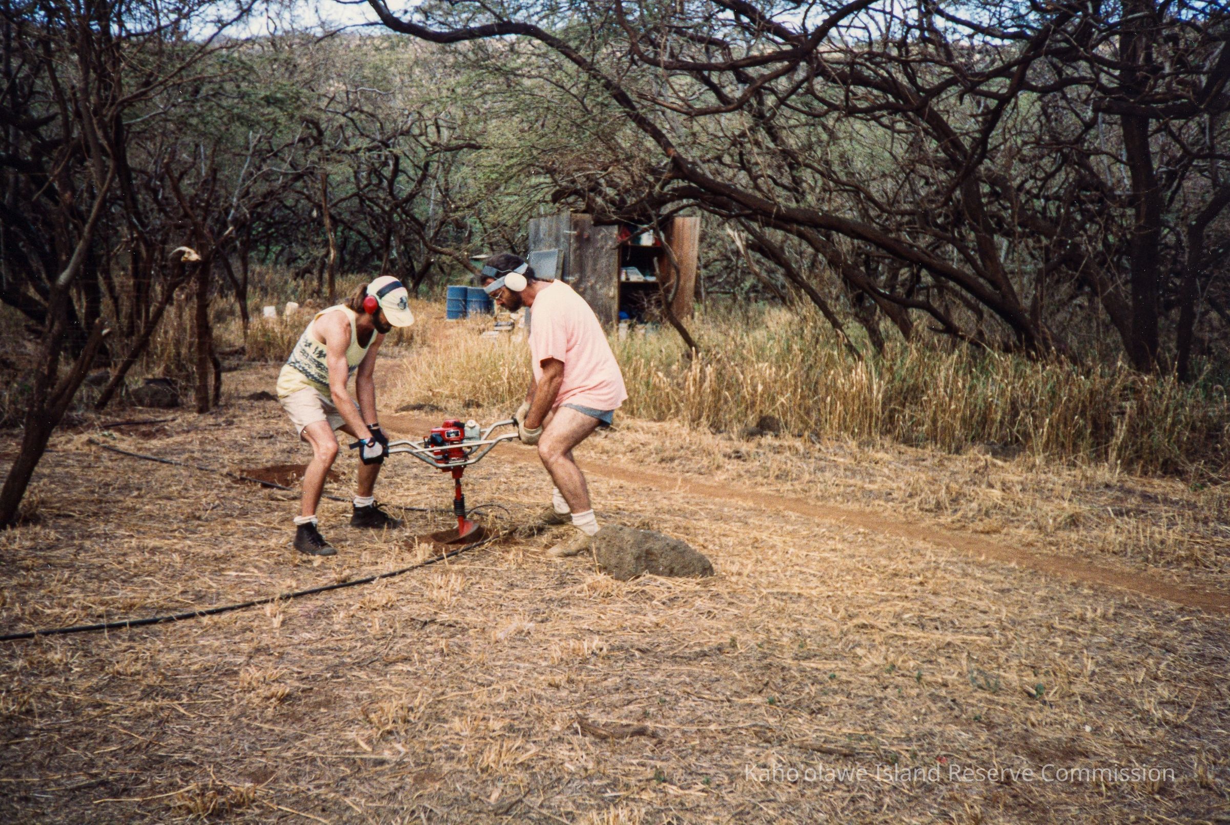 In a dry, grassy forest clearing, two individuals wearing protective ear gear are operating a red auger for digging, surrounded by barren, leafless trees.