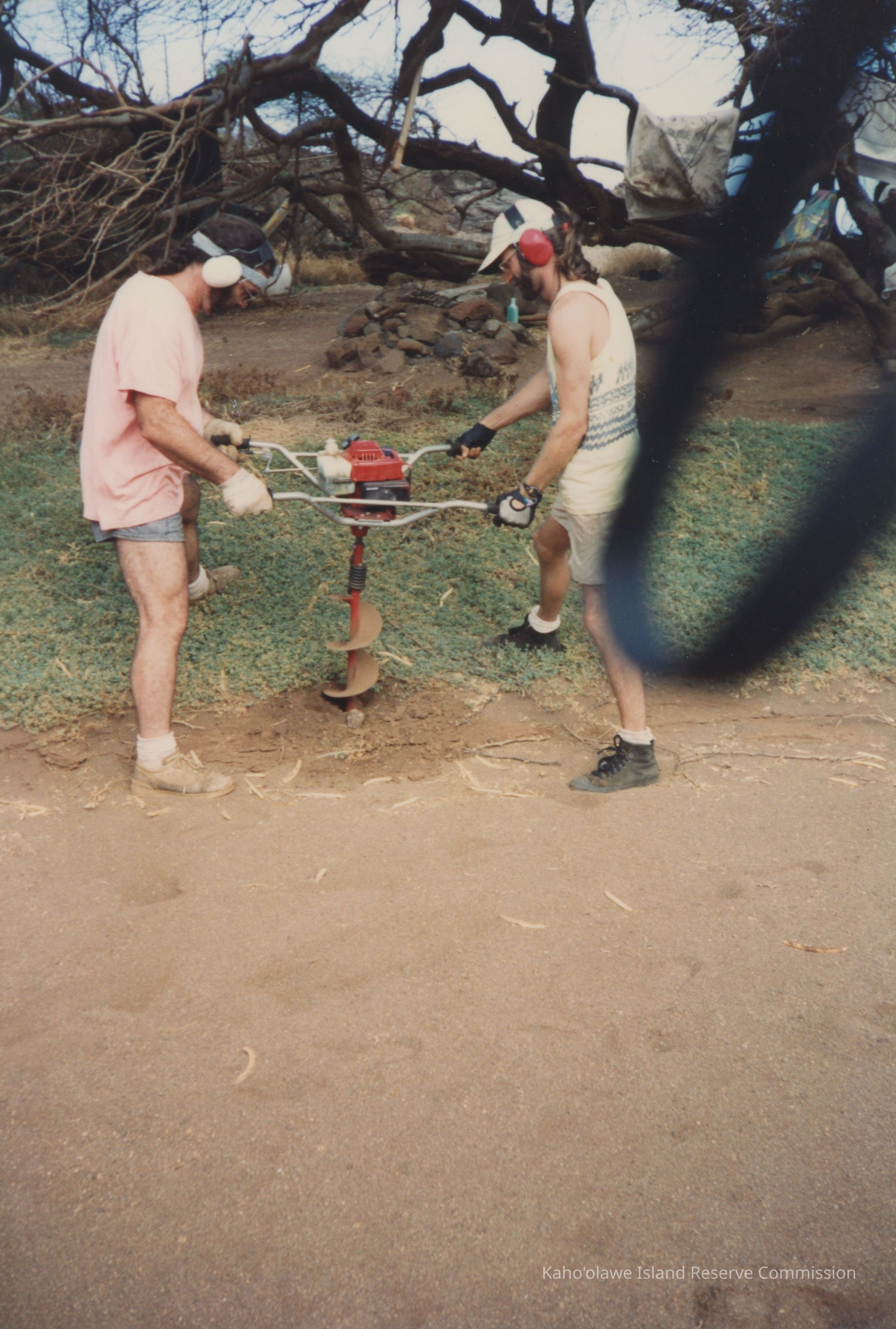 Color photograph of two men operating auger digging a hole near forests. This photograph was probably taken in Hakioawa.