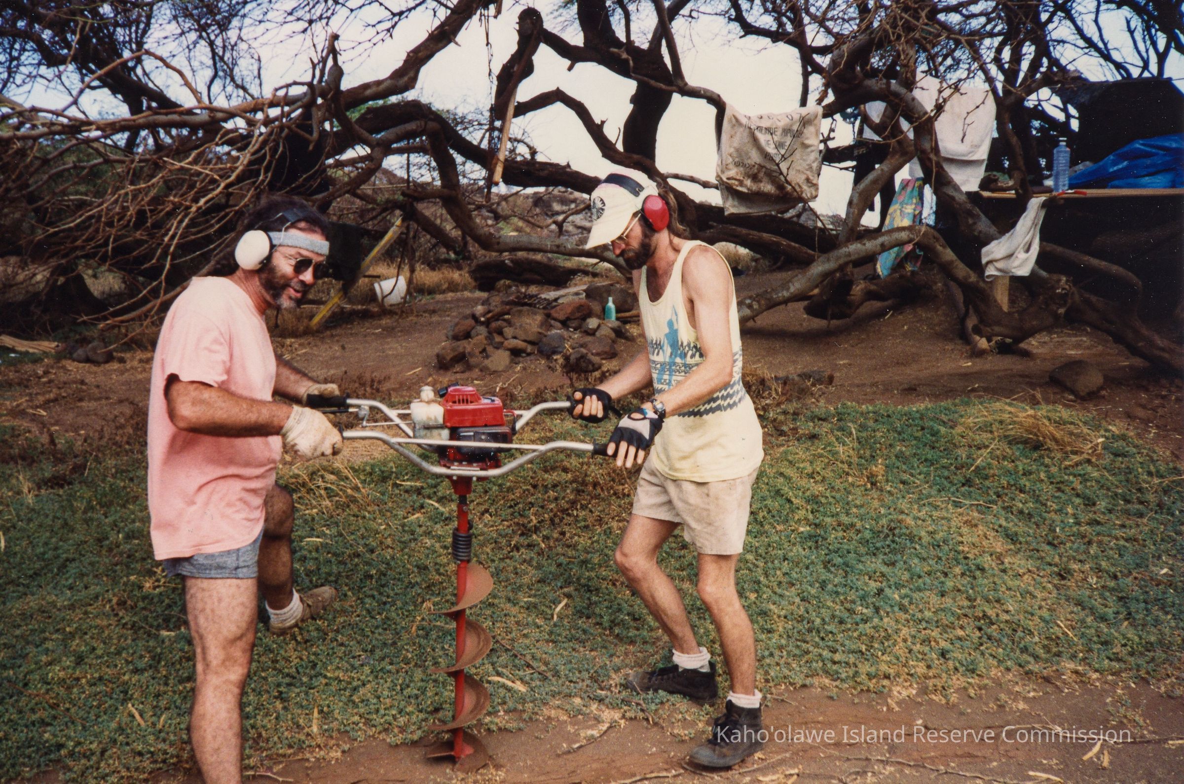 Two men, wearing gloves and ear protection, operate a red, gas-powered earth auger in a dry, tree-filled outdoor setting.