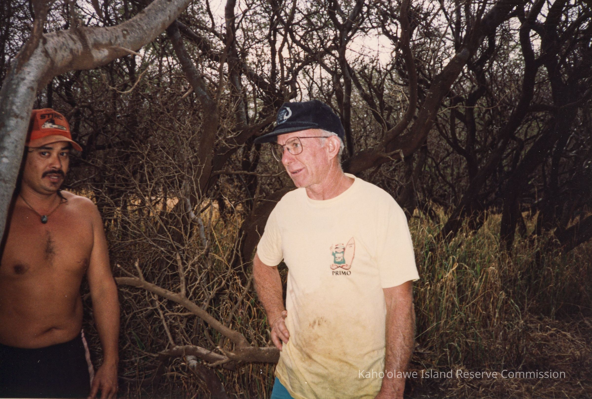 Color photograph of two unidentified men (one shirtless and one wearing a "Primo" white t-shirt) standing in a grove of trees.