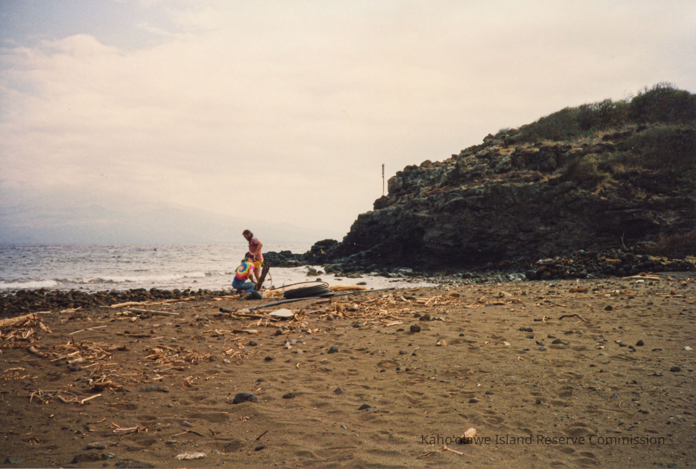 Color photograph of two unidentified men uncoiling irrigation line on the shore of a semi-rocky beach. This photograph was probably taken at Hakioawa.