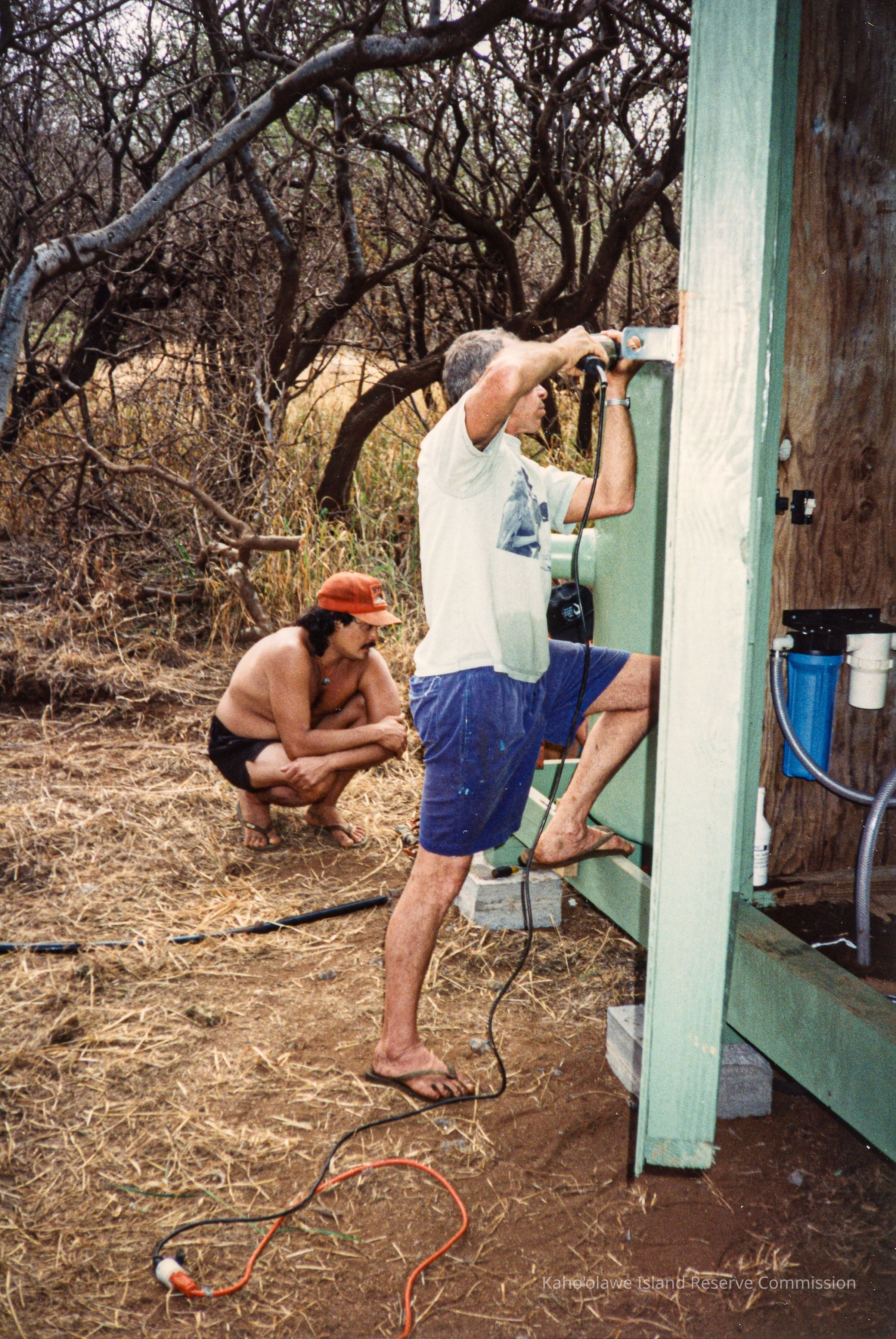 Two people are working on an irrigation station in a dry, wooded area, using tools and equipment, surrounded by trees and dry grass.