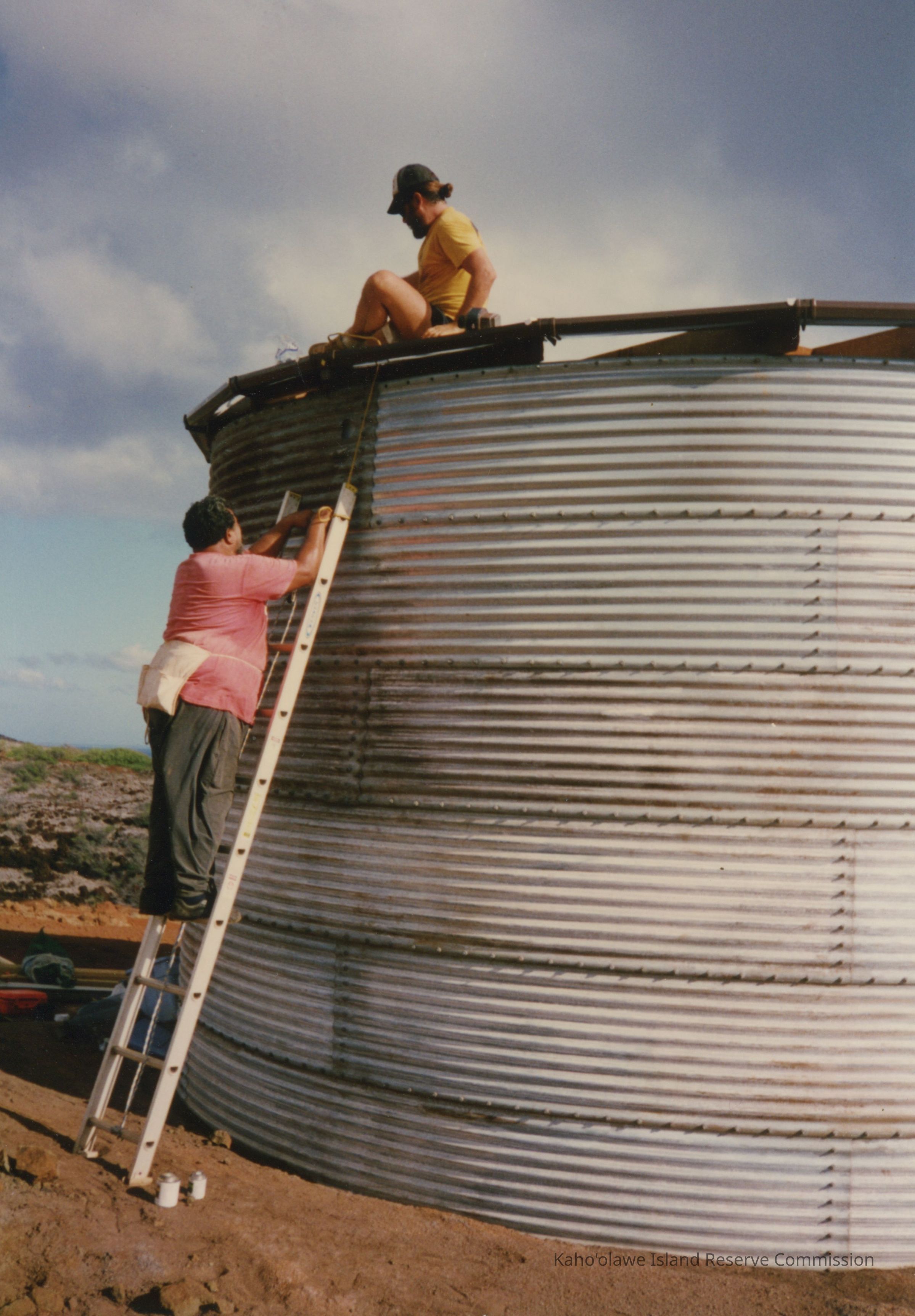 Color photograph of two unidentified men working on a water tank. One man is standing on a ladder leaning against the water tank sitting on hardpan. The other man is sitting on top of the water tank.