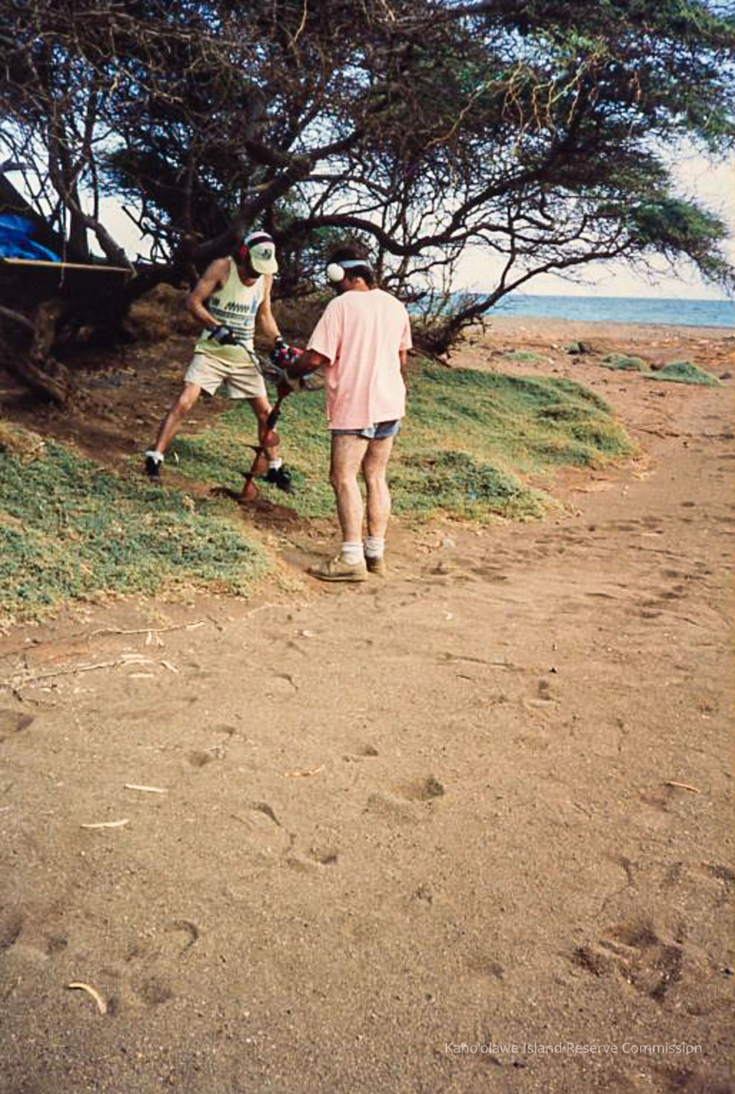 Two men are using an auger on a sandy path near the beach, surrounded by sparse trees and grass on a sunny day.