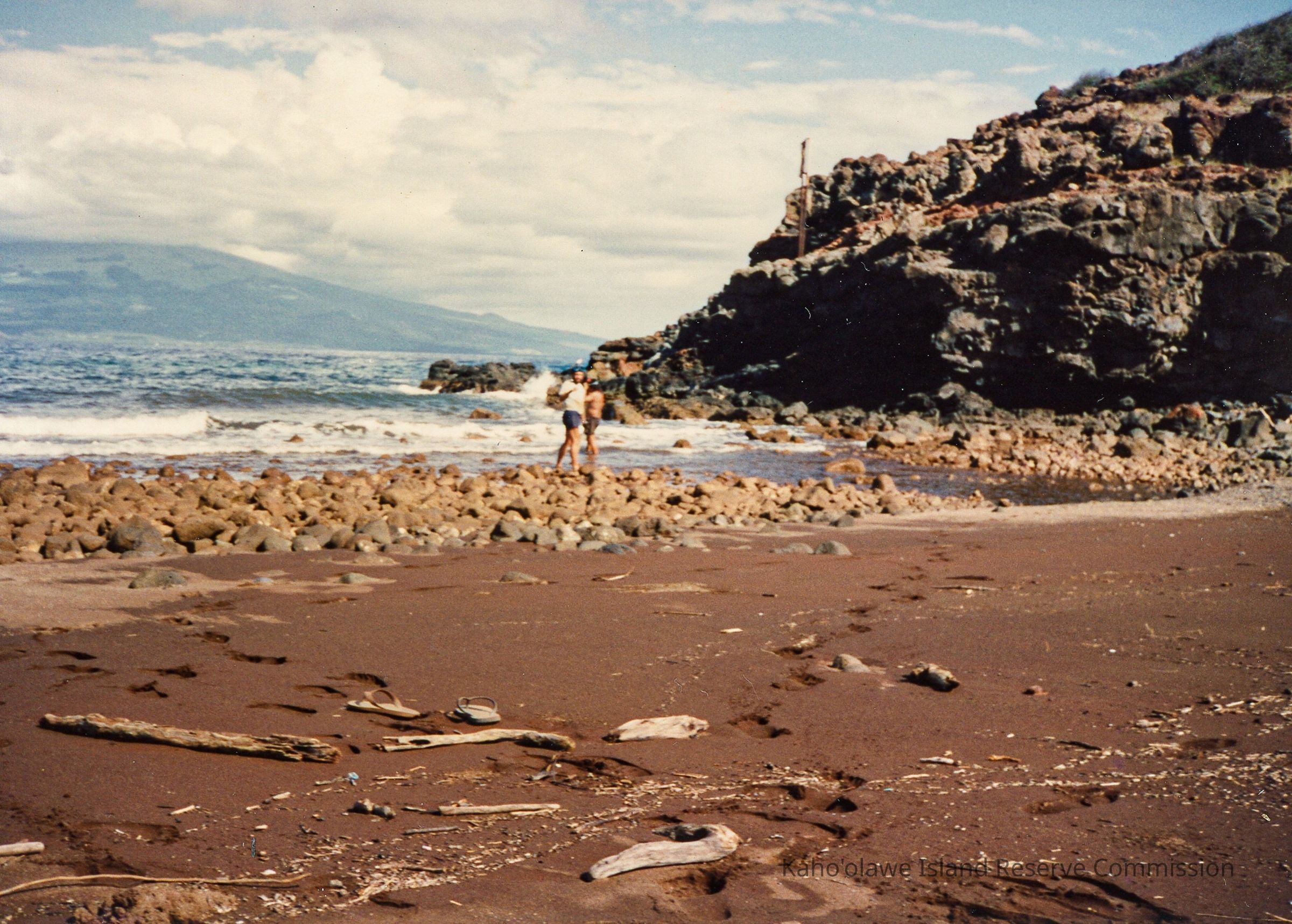 Color photo of two unidentified men standing on rocky shoreline with Maui in the far background. The hand-written notation on a page several pages in front of the page holding this photo in the original photo album read: "November 14-17 1993; Advance Crew Before Makahiki." This photo may have been taken at Hakioawa Bay.