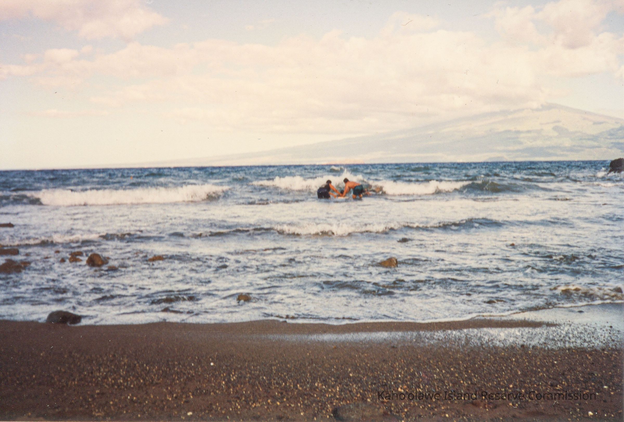 Color photo of two unidentified people pushing another unidentified person laying on a boogie board into the ocean off a beach. There was a hand-written notation on a page several pages in front of the page which held the photo in the original photo album. The notation read ""November 14-17 1993; Advance Crew Before Makahiki." This photo may have been taken at Hakioawa Bay.Photograph Details
