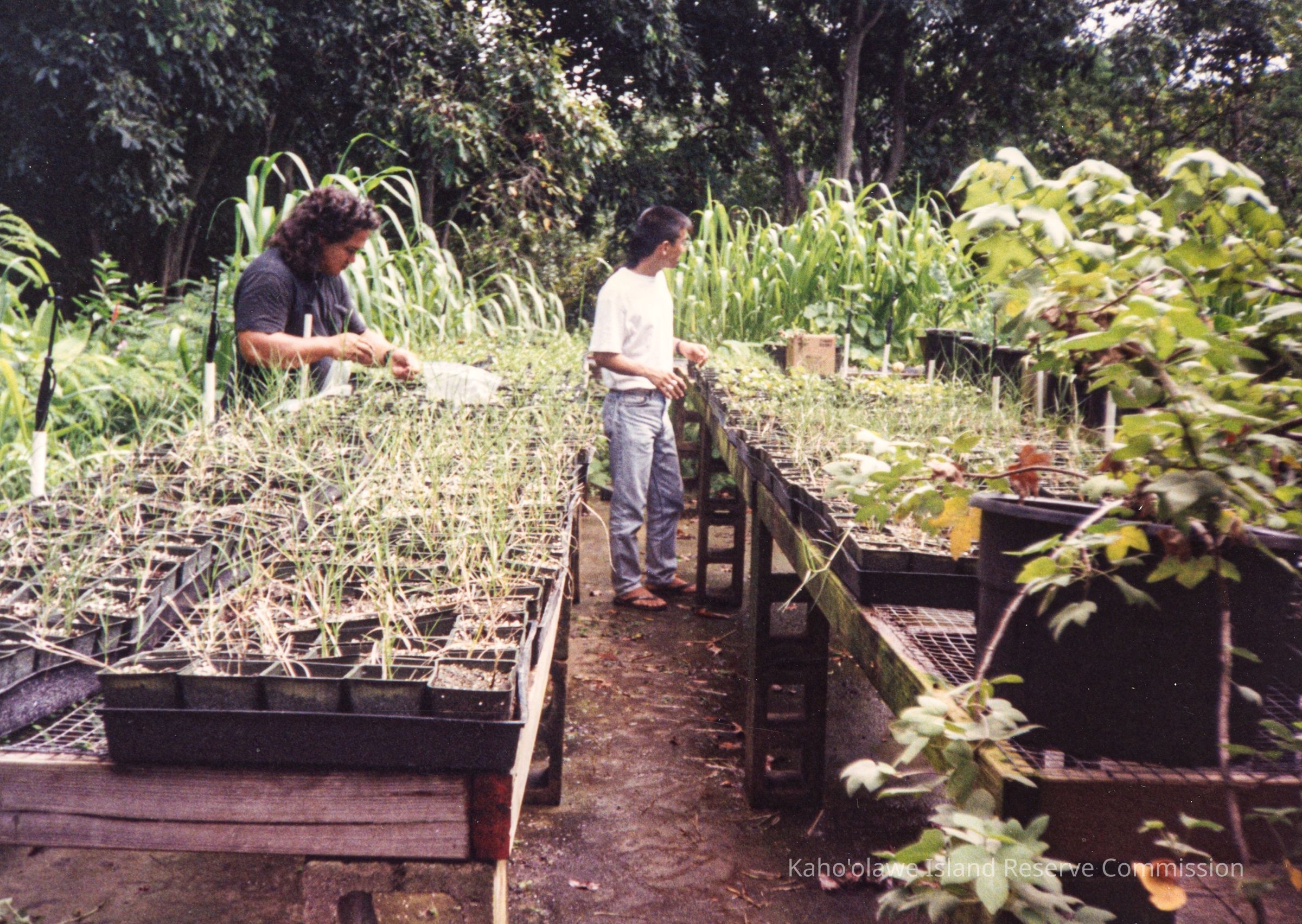 Color photograph of two unidentified people working on plants on propagation table at Paul Higashino's residence. These plants were later planted on Kaho'olawe.