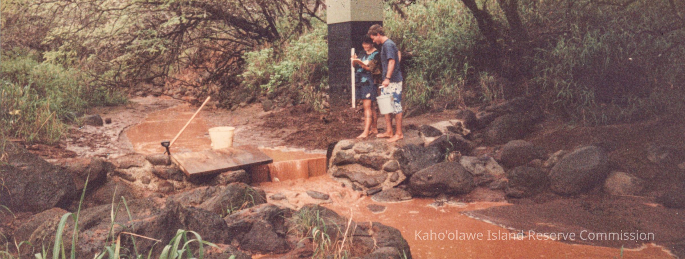 Panoramic color photograph of two unidentified people standing on the banks of a flowing stream (possibly Hakioawa Stream). One person is recording in a notebook as the other looks on while holding a bucket.