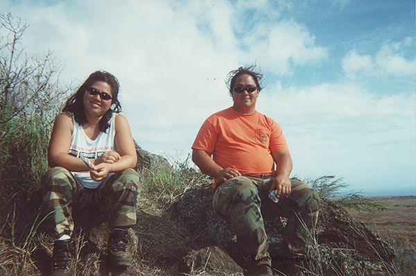 Color photo of Lei Ishikawa (right) and an unidentified man sitting on pohaku (rocks) in an unidentified area.Collection