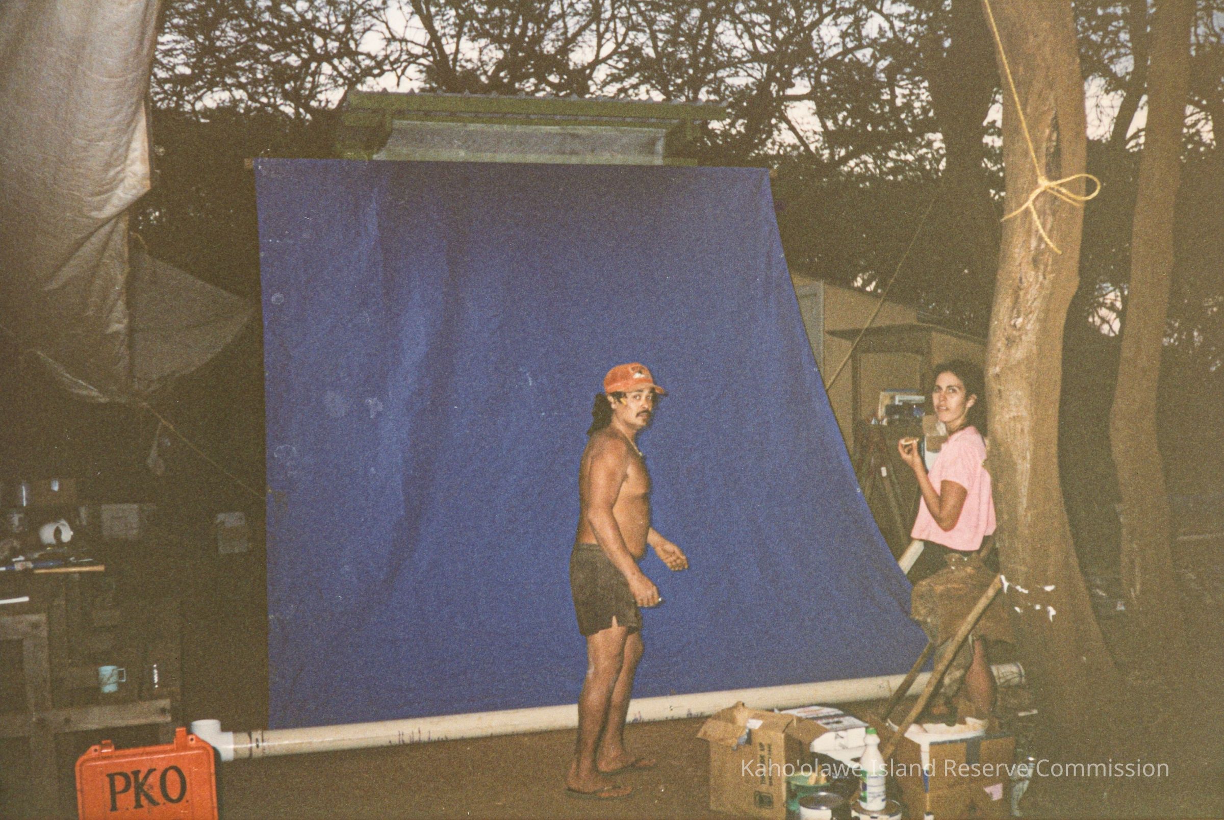 Two people standing in front of a blue tarp