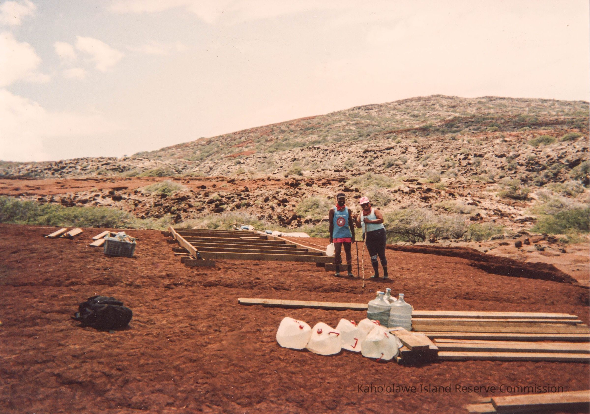 Color photo of two unidentified people standing in front of a wooden frame on hardpan terrain. Photo possibly taken at Wailuna in Hakioawa 'Ili