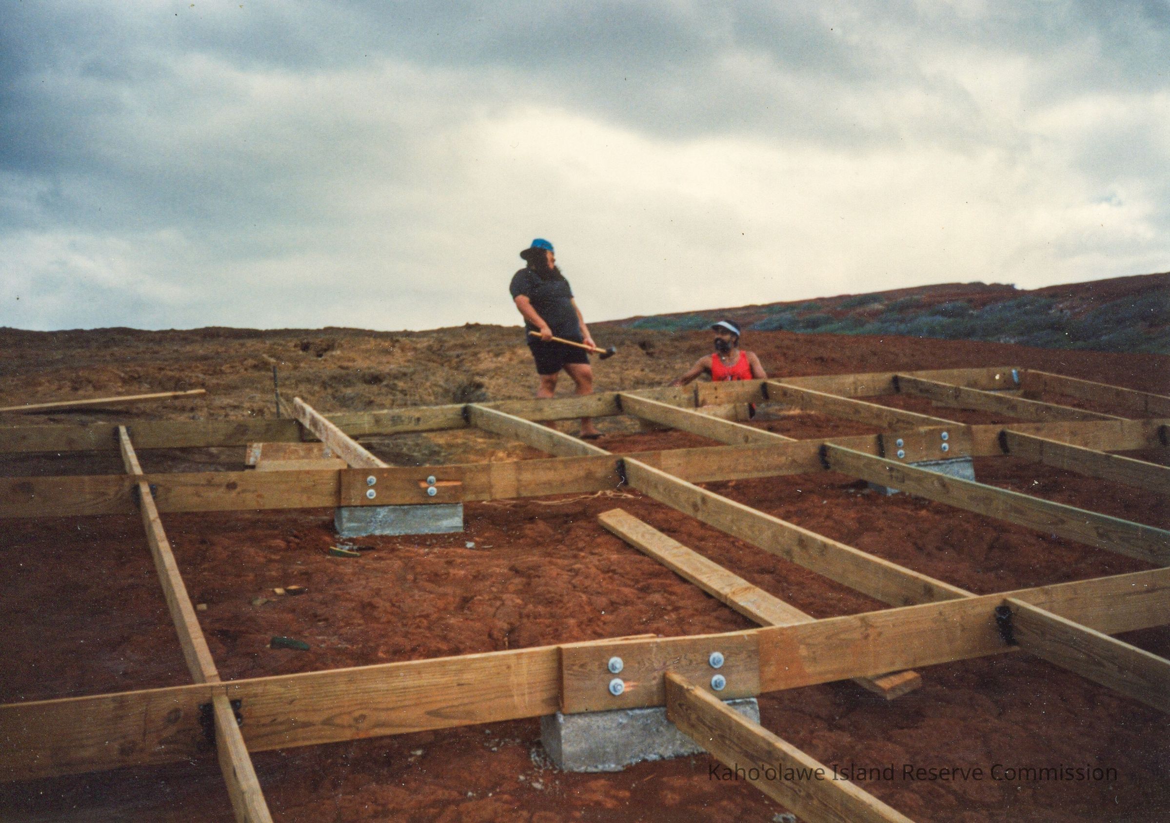 Color photo of two unidentified people talking near a wooden frame for a structure foundation on hardpan. One person is holding a mallet and the other sitting.