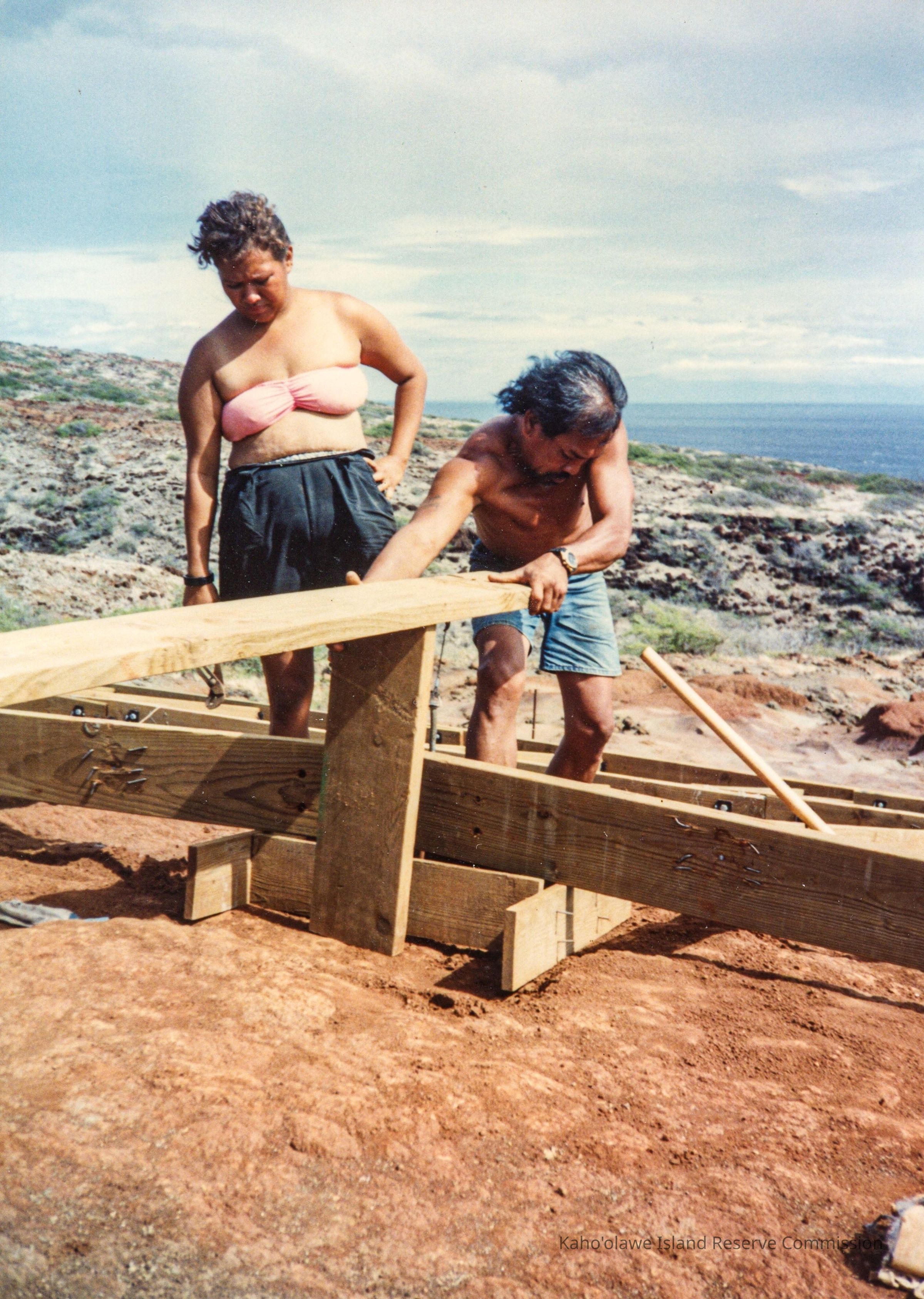 Color photo of an unidentified man assembling part of a wooden frame on hardpan while an unidentified woman looks on. This photo was probably taken at Wailuna in Hakioawa 'Ili.