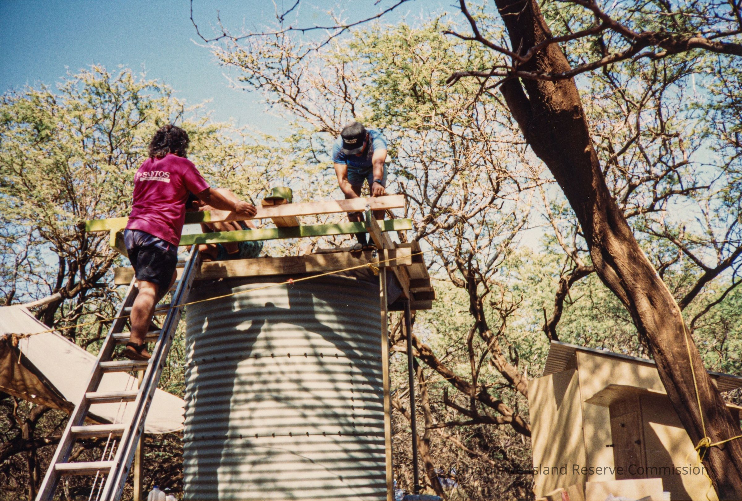 Color photo of two unidentified people working on top of a water catchment structure. One person is standing on a ladder. The structure is next to a shed and tarp-covered shelter. This photo was probably taken in Hakioawa.