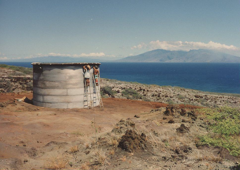Color photo of two unidentified people working on water tank.
