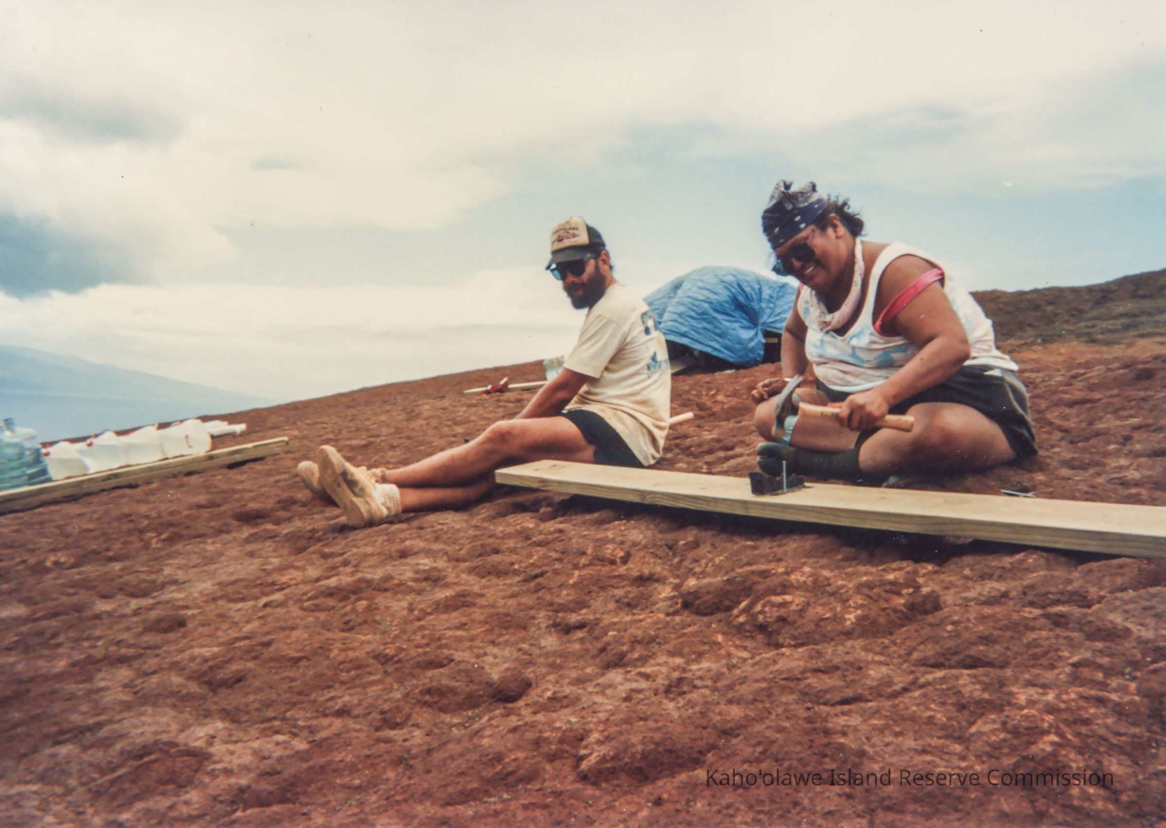 Color photo of a man with a cap and sunglasses sitting on hardpan and watching a woman wearing a bandana and sunglasses hammering a nail into a wooden plank. There are large water bottles and a tarp-covered pile of unknown items. This photo may have been taken during 1993 PKO (Protect Kaho'olawe 'Ohana) access to build a water catchment at Wailuna in Hakioawa 'Ii.
