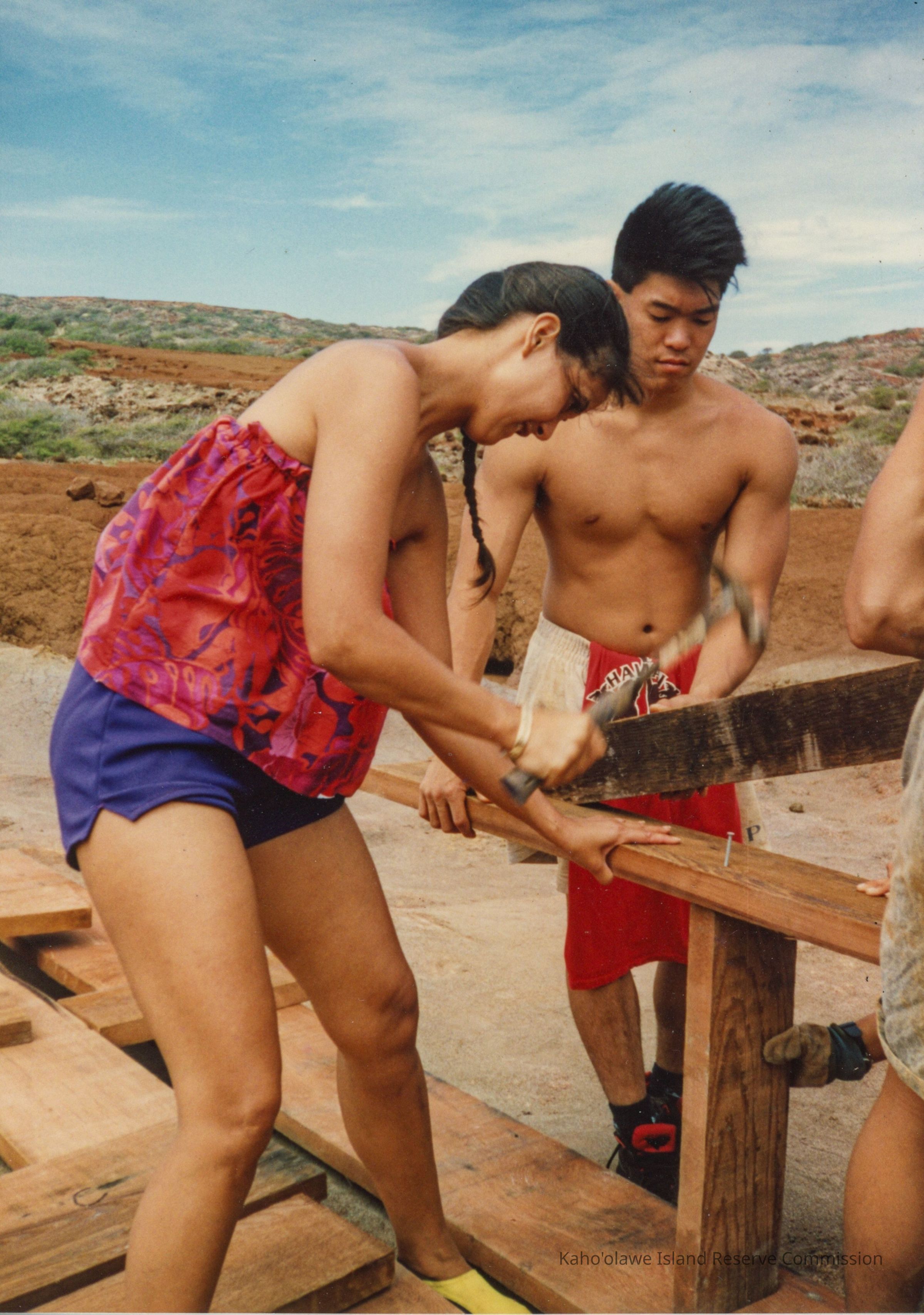 Color photo of two people working on a wooden frame. A wahine (woman) hammers a nail into a wooden plank while a kane (man) holds onto it.