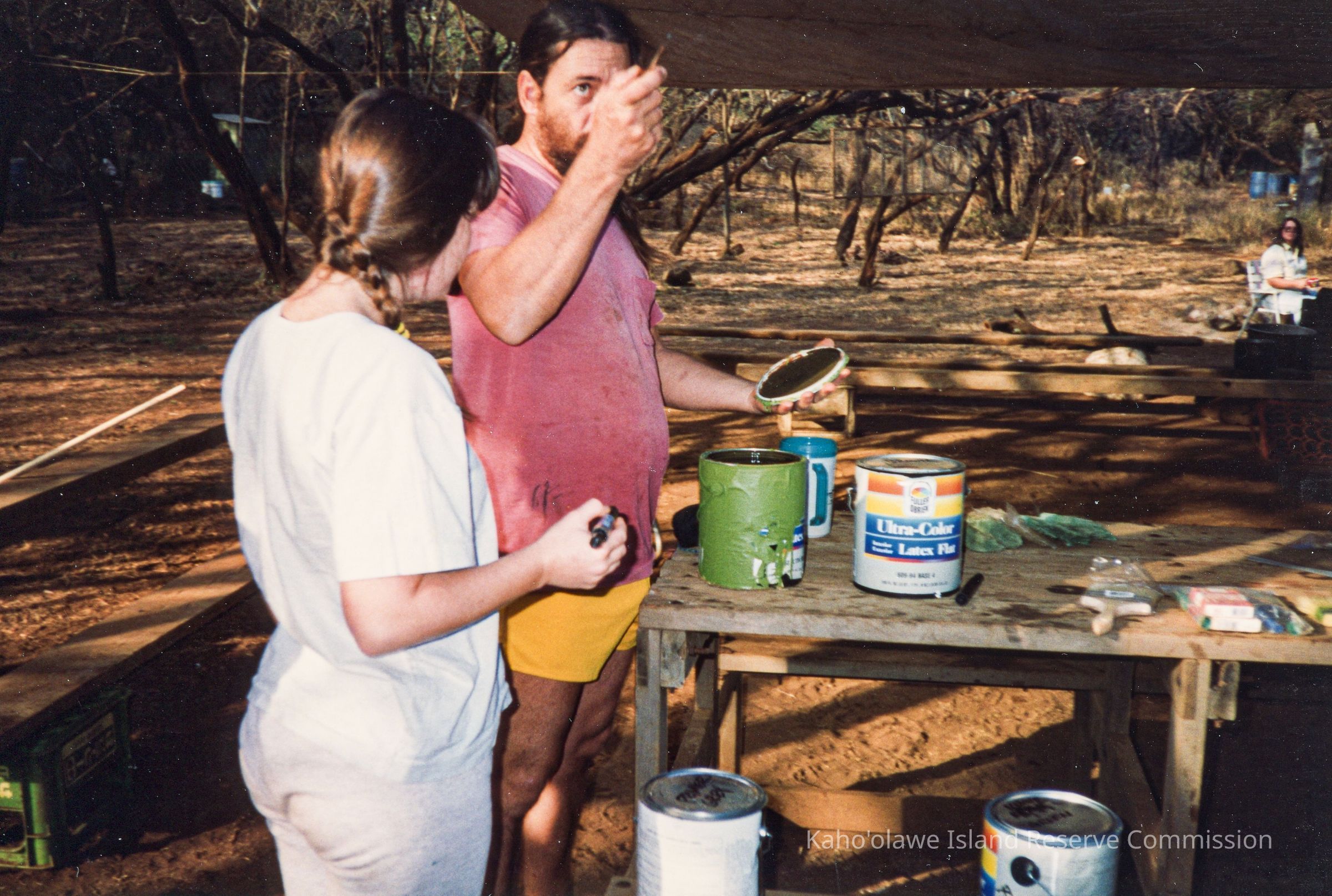 Color photograph of two unidentified people working with paint. This photograph was probably taken in Hakioawa.
