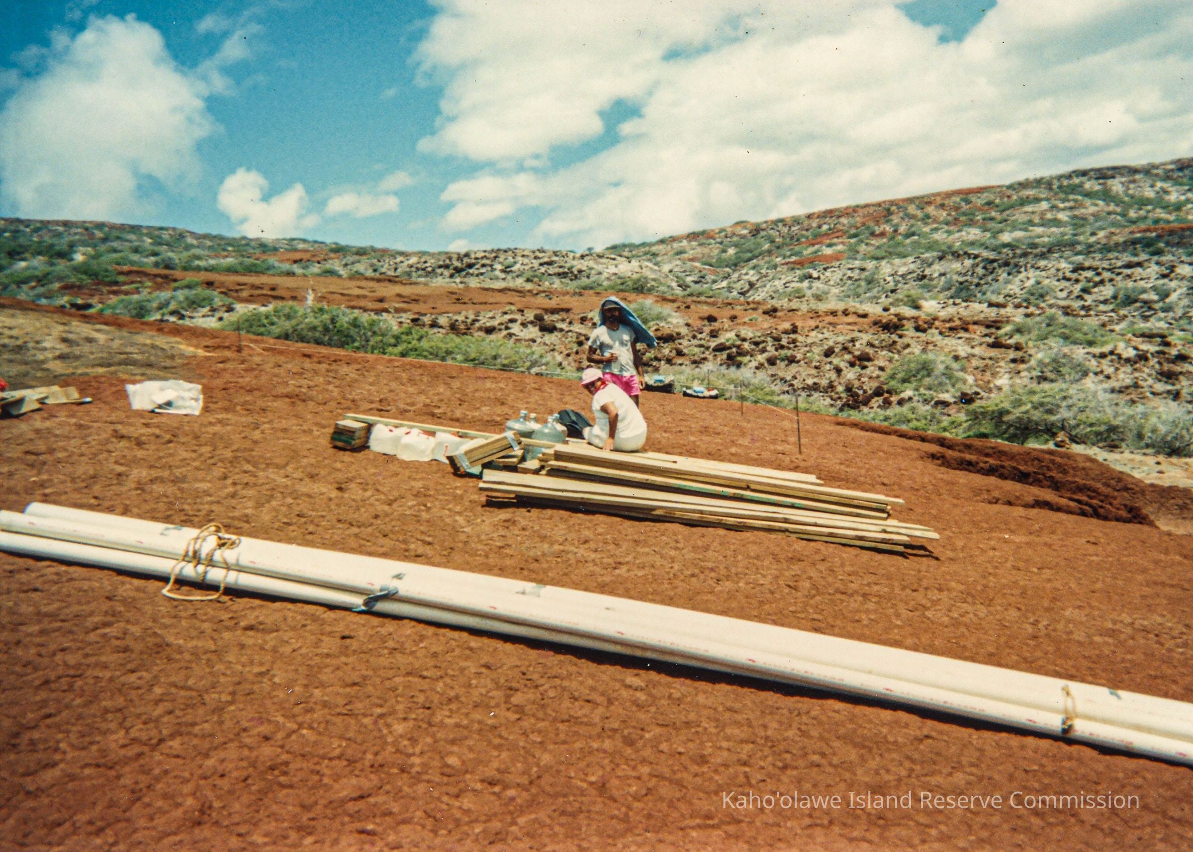 Color photo of two unidentified people at a construction site on hardpan terrain. One person is sitting down on a pile of lumber and the other is standing behind her shielding himself with a jacket. There are PVC tubes tied together are in the foreground.
