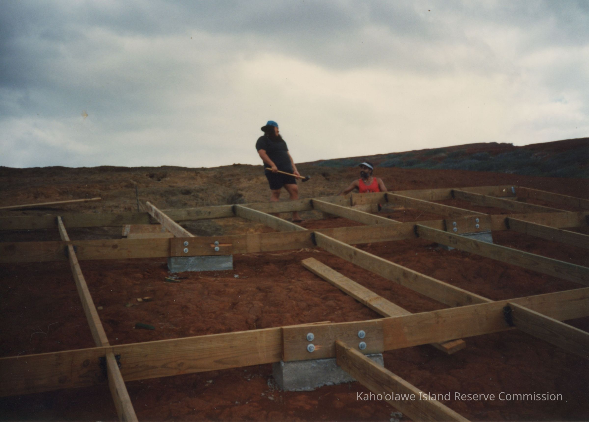 Color photograph of two unidentified persons working at a wooden frame for a water catchment structure situated on hardpan terrain. One person is standing the other is sitting.