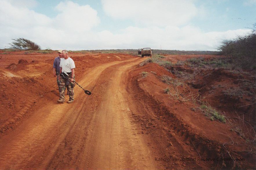 Photo of two unidentified men, one with a detector, walking along a dirt road with a pickup truck in the distance.Collection