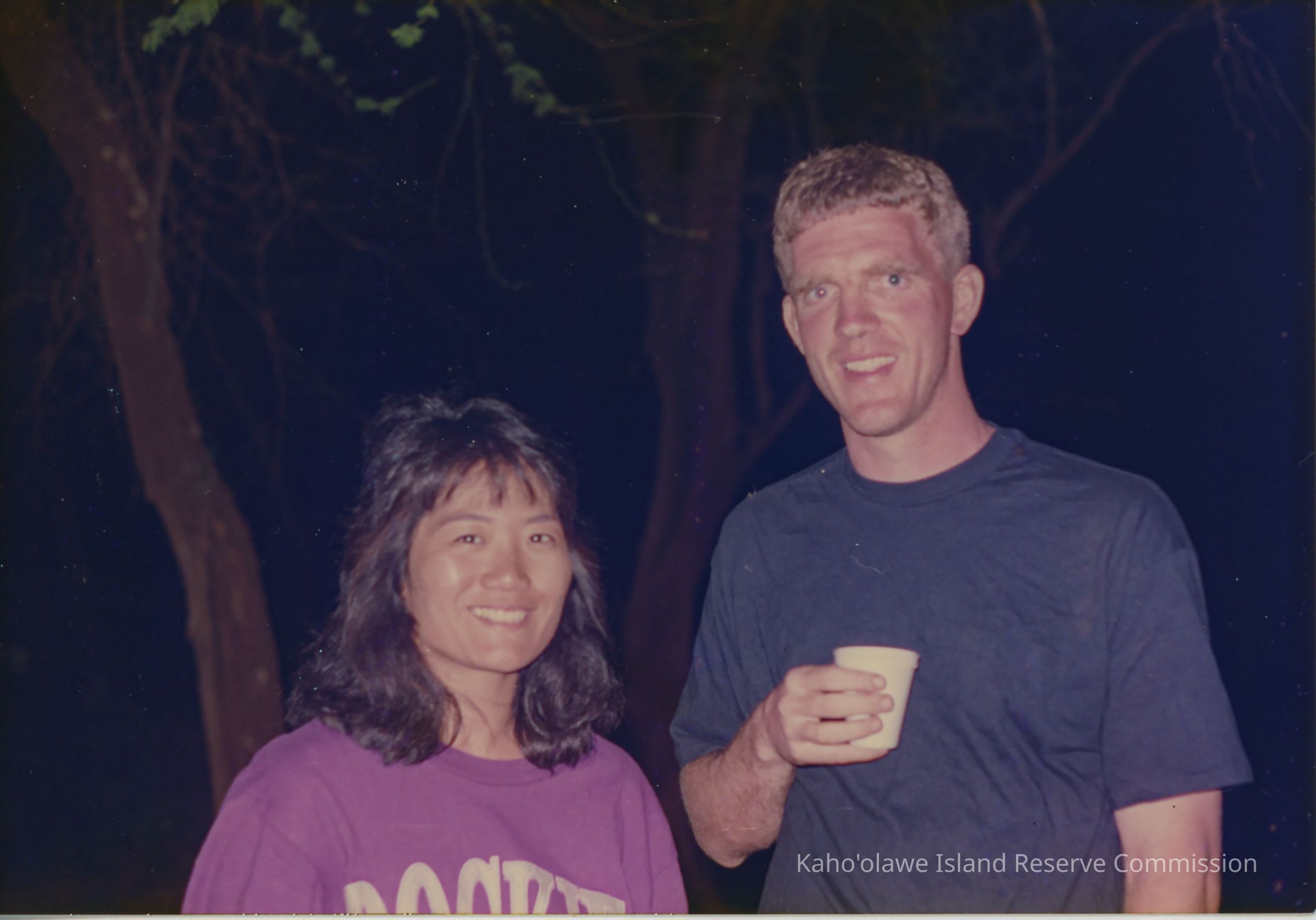 A woman and a man stand outdoors at night, smiling gently at the camera; the man holds a cup, and trees are visible in the background.