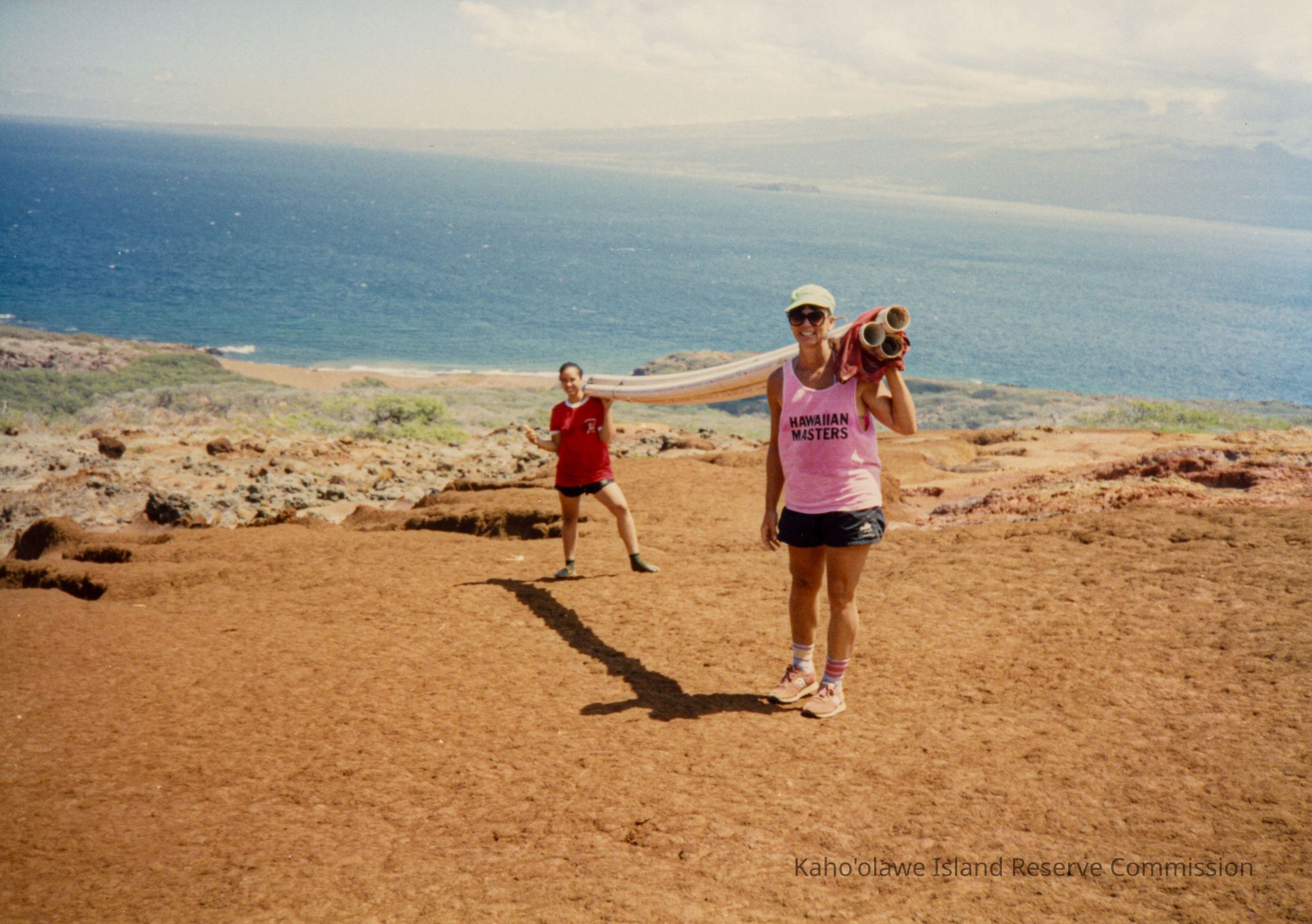 Color photograph of two unidentified women who are carrying three PVC pipes on hardpan terrain. The ocean, Molokini and Maui are in the background. The ocean, Molokini and Maui are in the far background.