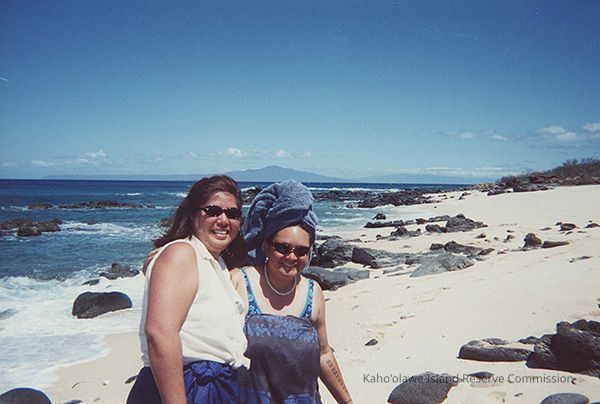 A color photo of Lei Ishikawa and an unidentified woman on a white, sandy beach in an unidentified area with Lana'i in the background.Collection