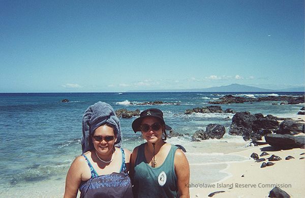 A color photo of two women standing on a white sandy beach strewn with rocks in an unidentified area. The island of Maui is in the far background.Collection