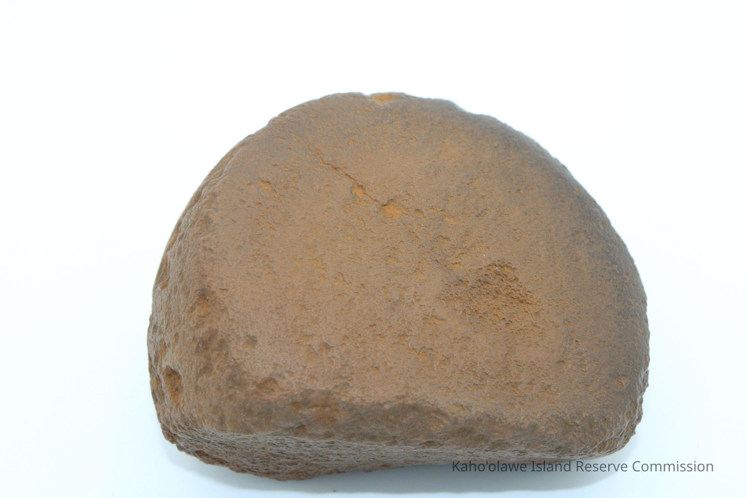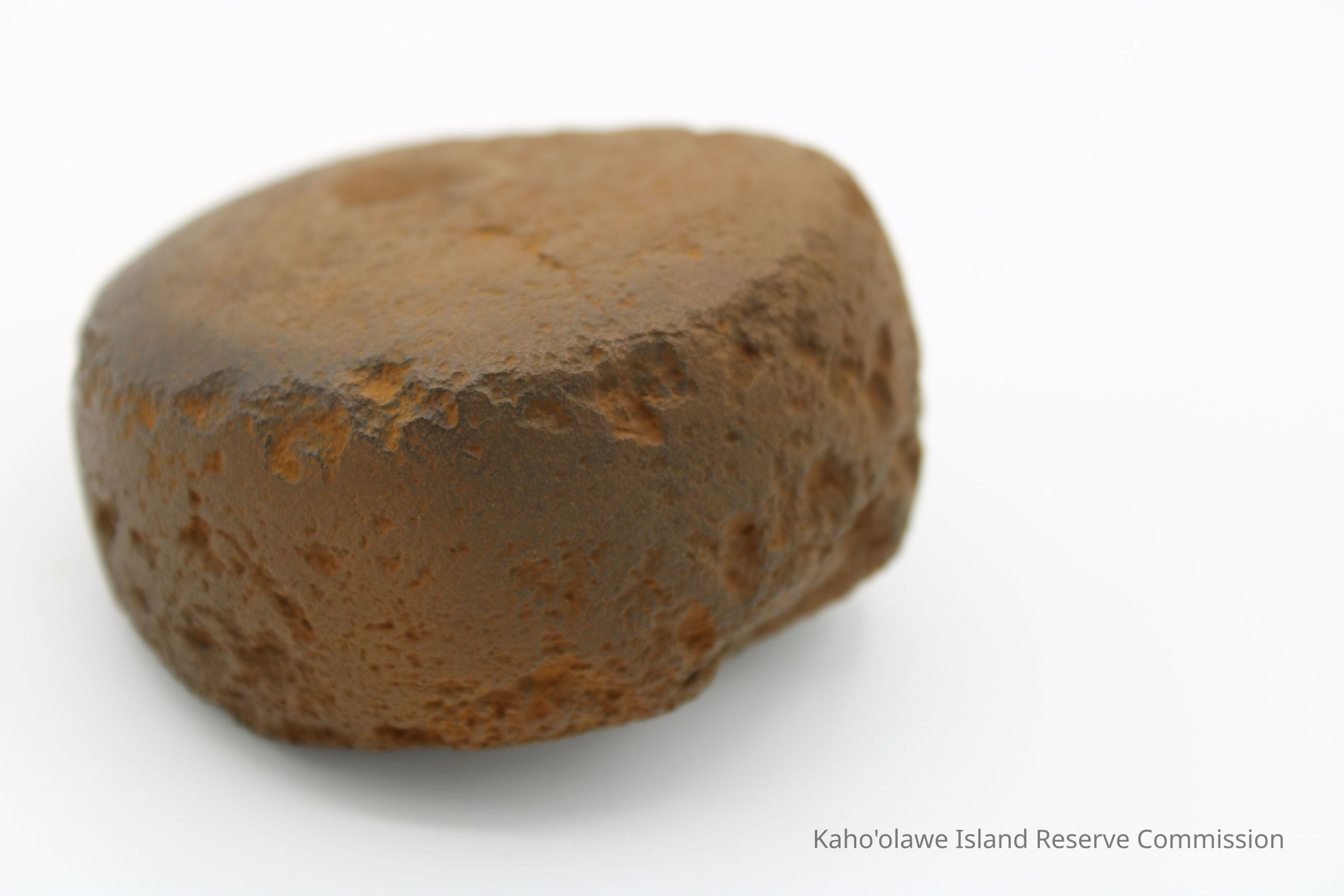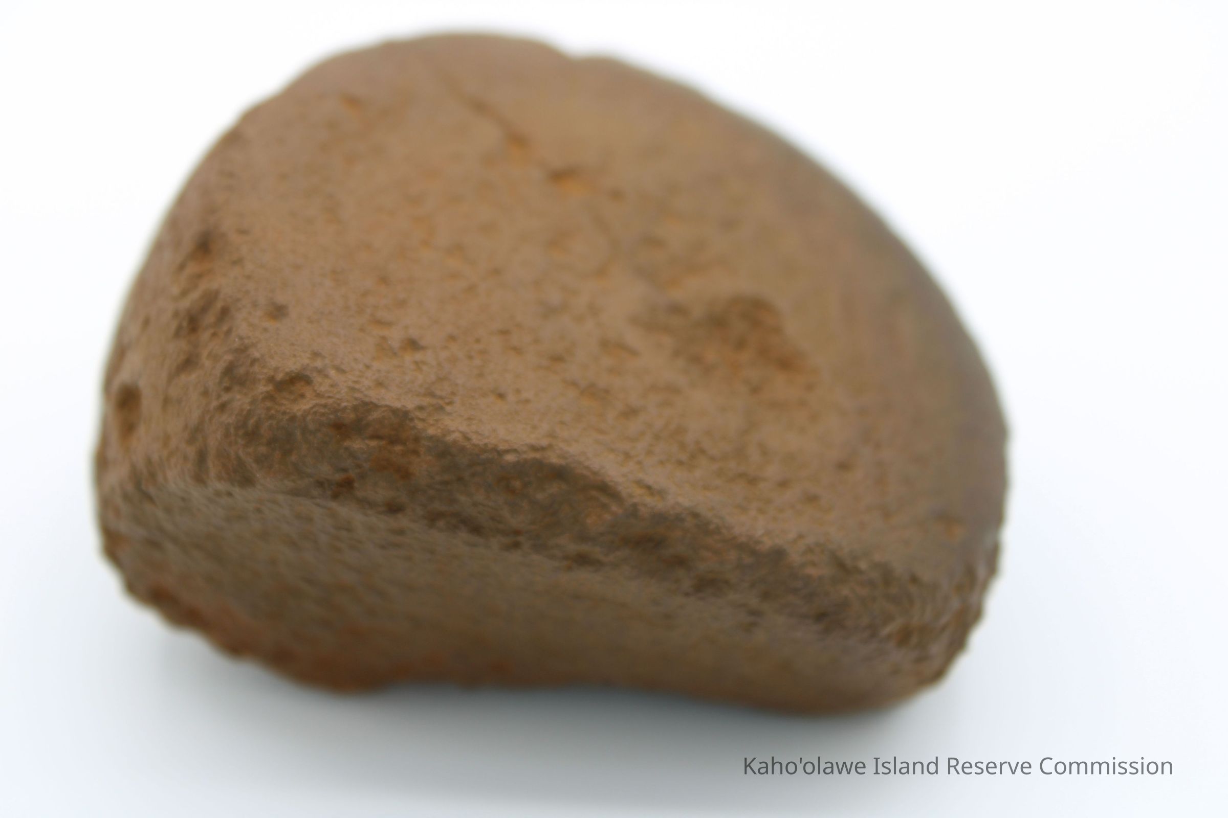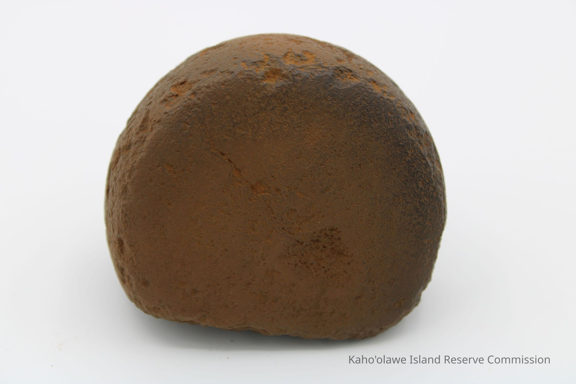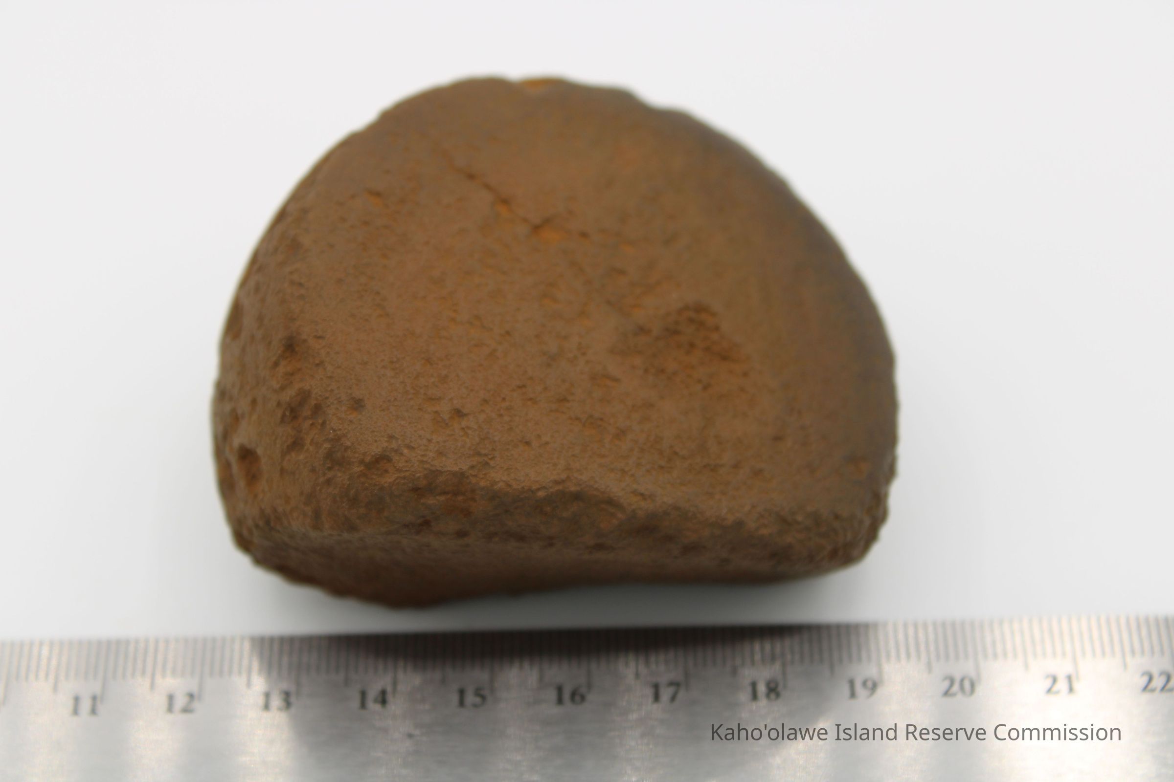 The image shows a traditional 'ulu maika (stone used in the Hawaiian game of maika), placed alongside a ruler for scale comparison.