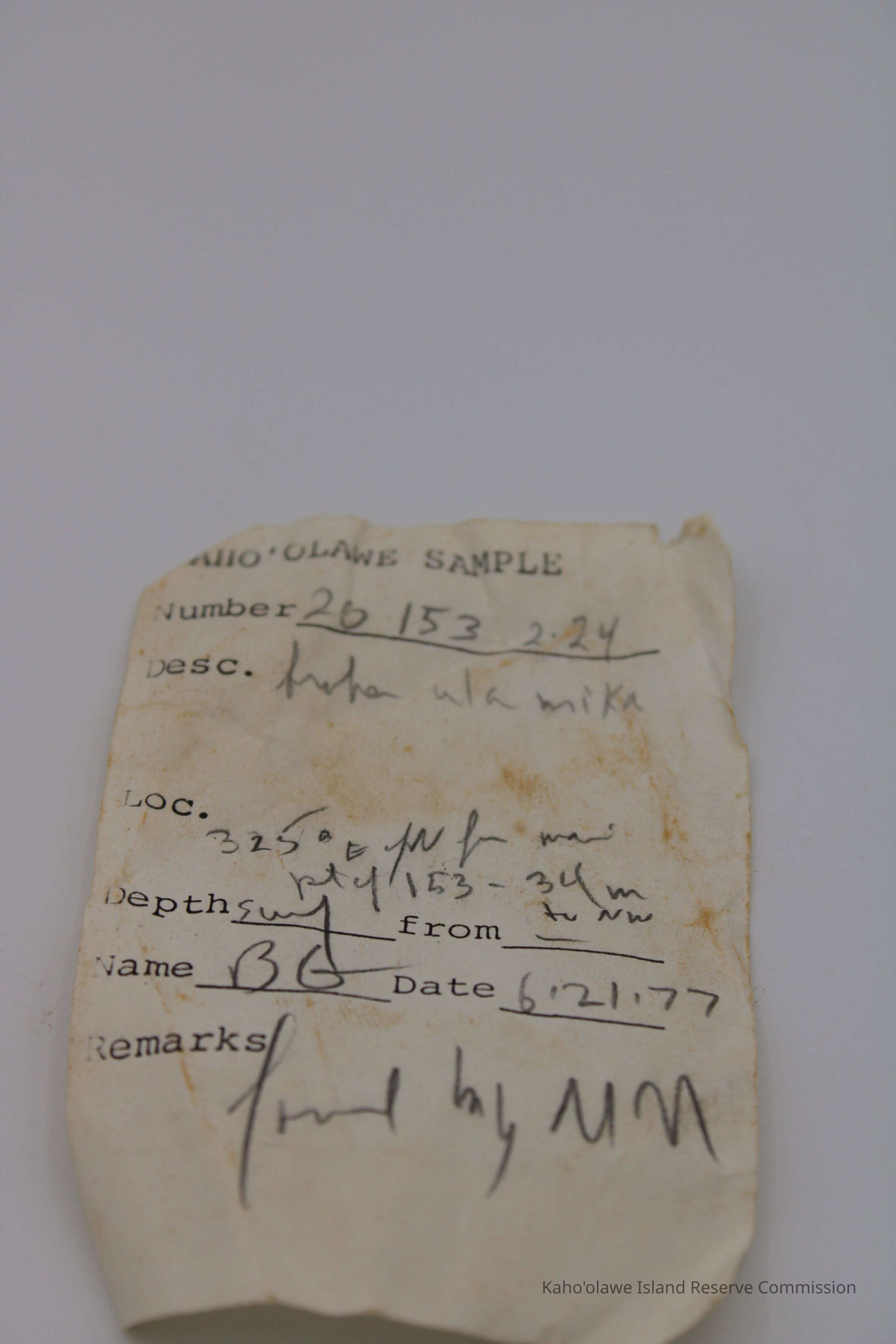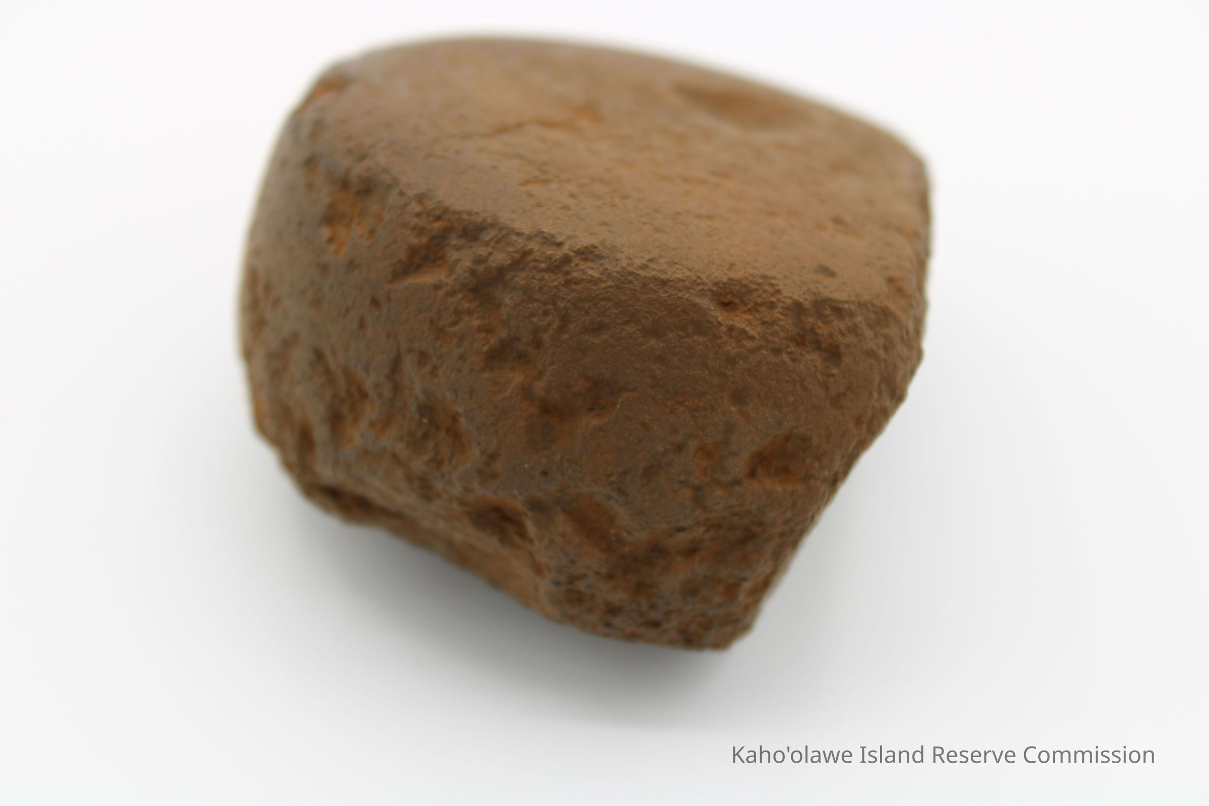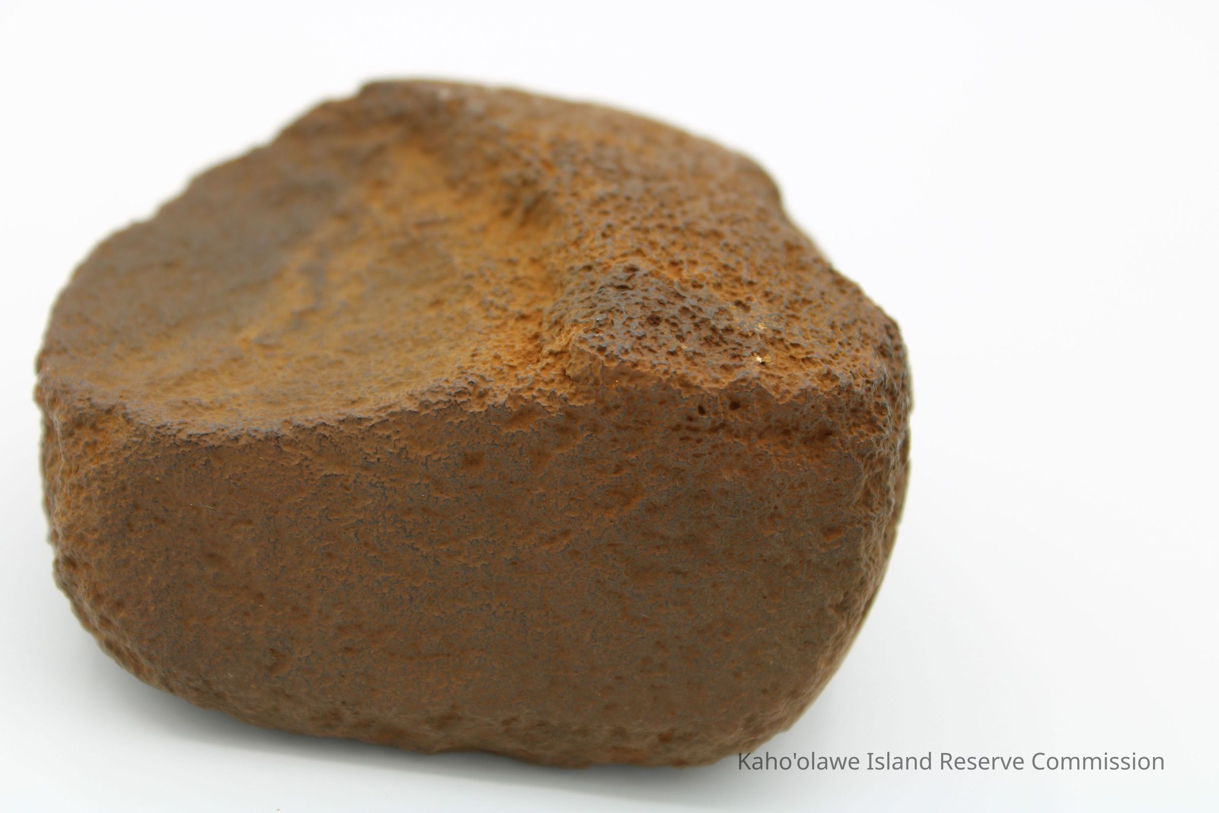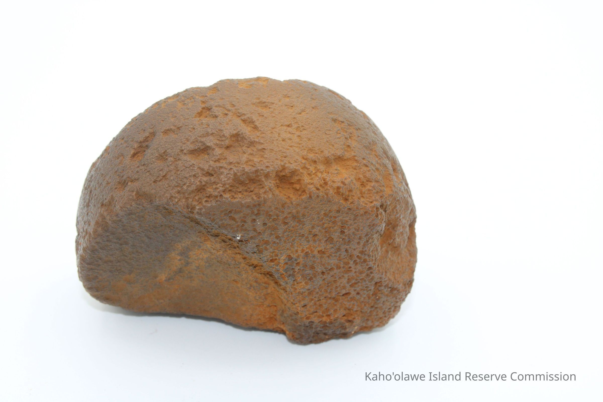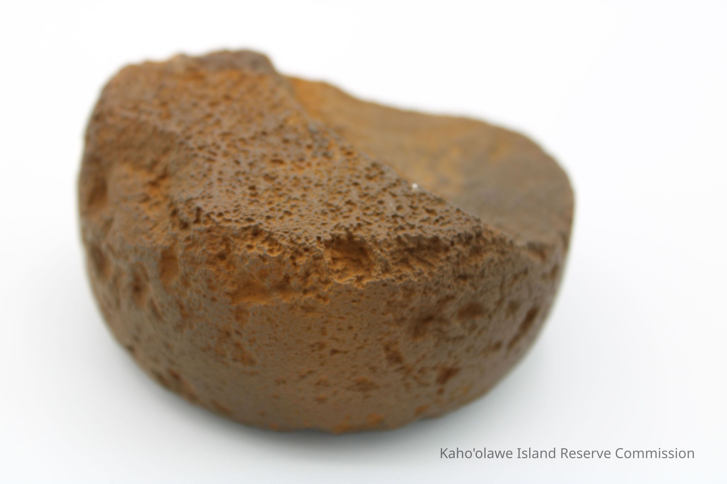 The image shows a traditional 'ulu maika (stone used in the Hawaiian game of maika), placed alongside a ruler for scale comparison.