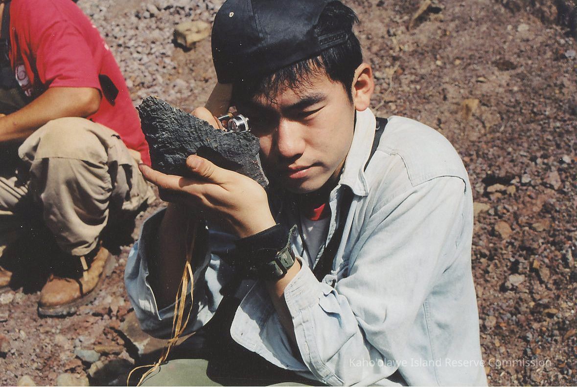 Unidentified man examining rock