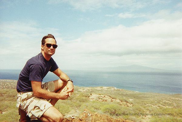 Color photo of an unidentified man with sunglasses kneeling in an unidentified area with possibly Lana'i in the far background.Collection