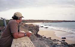 Film negative image of an unidentified man wearing a cap looking at an excavator in the far distance. He is standing on a deck at Base Camp.Collection