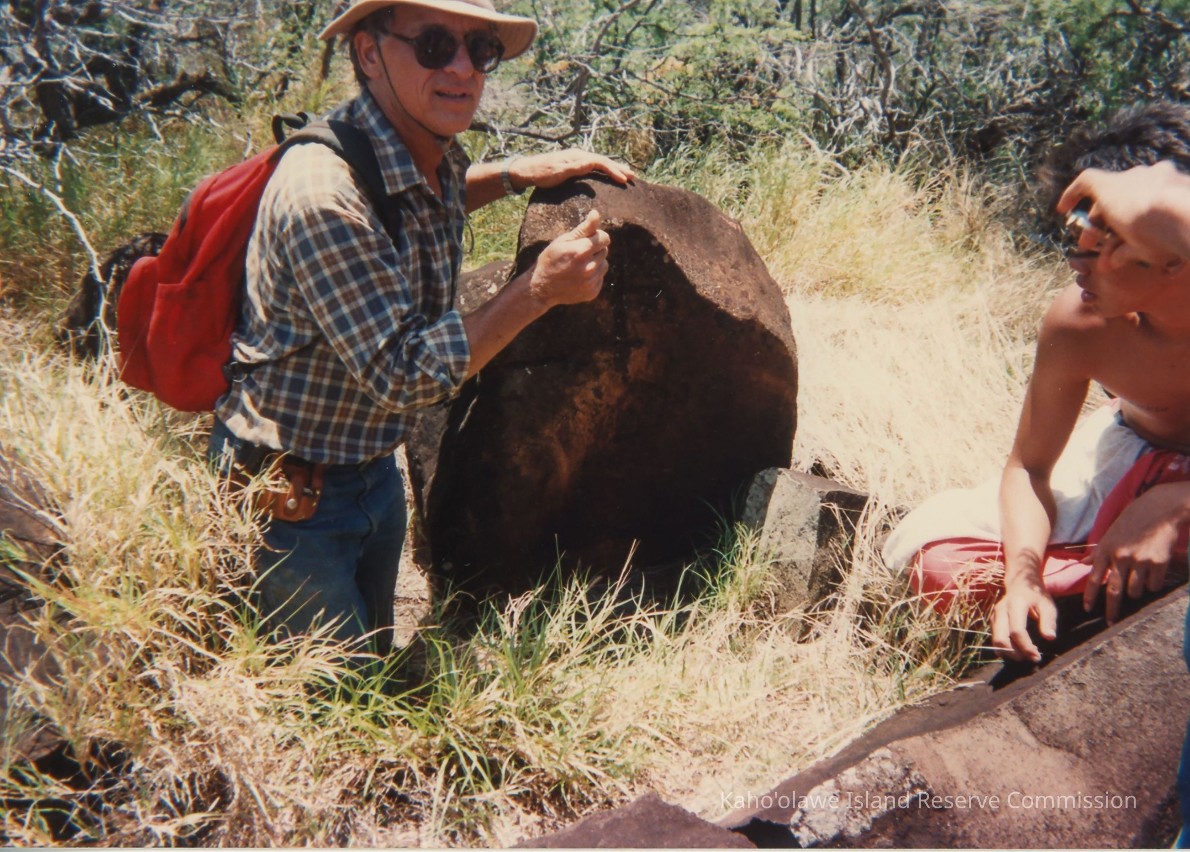 Unidentified man talking at rock with petroglyphs (ki'i pōhaku)