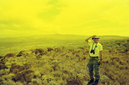 Negative image of an unidentified man with hat and binoculars standing/posing in front of a group of pohaku (stones) in an unidentified area.