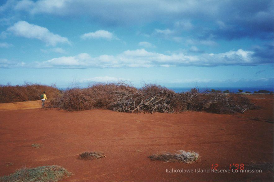 An unidentified person walking amongst several brush piles, probably in the Lua 'O Kealialalo/Seagull area.Collection