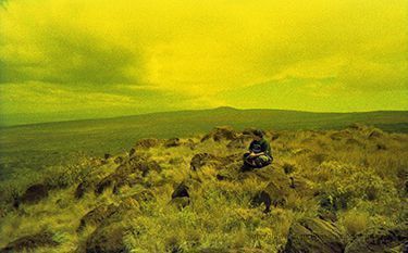 Negative image of an unidentified person sitting cross-legged on a large pohaku (boulder) looking at the landscape in an unidentified area with a cloud bridge above.