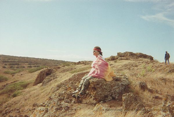 Color photo of unidentified person sitting on a pohaku (possibly the Navigator's Chair).Collection