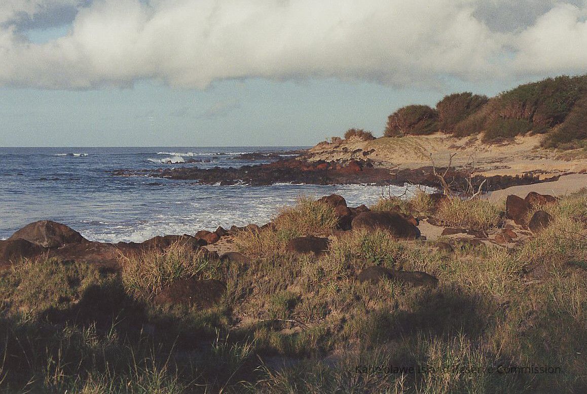 Color photo of an unidentified shoreline with white sand beach and multi-colored rocks.