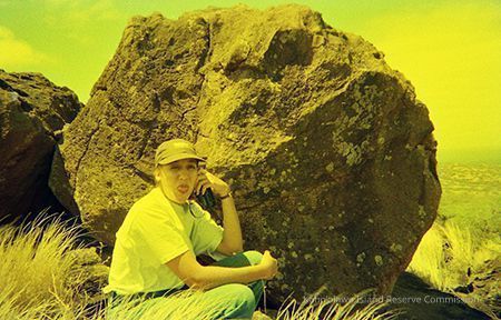 Negative image of an unidentified woman wearing a hat squatting in front of a large pohaku (stone) and sticking her tongue out.