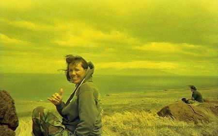Negative image of an unidentified woman at an unidentified location throwing a shaka with another person sitting on a pohaku to the right in the background. The ocean and Maui are also in the background.