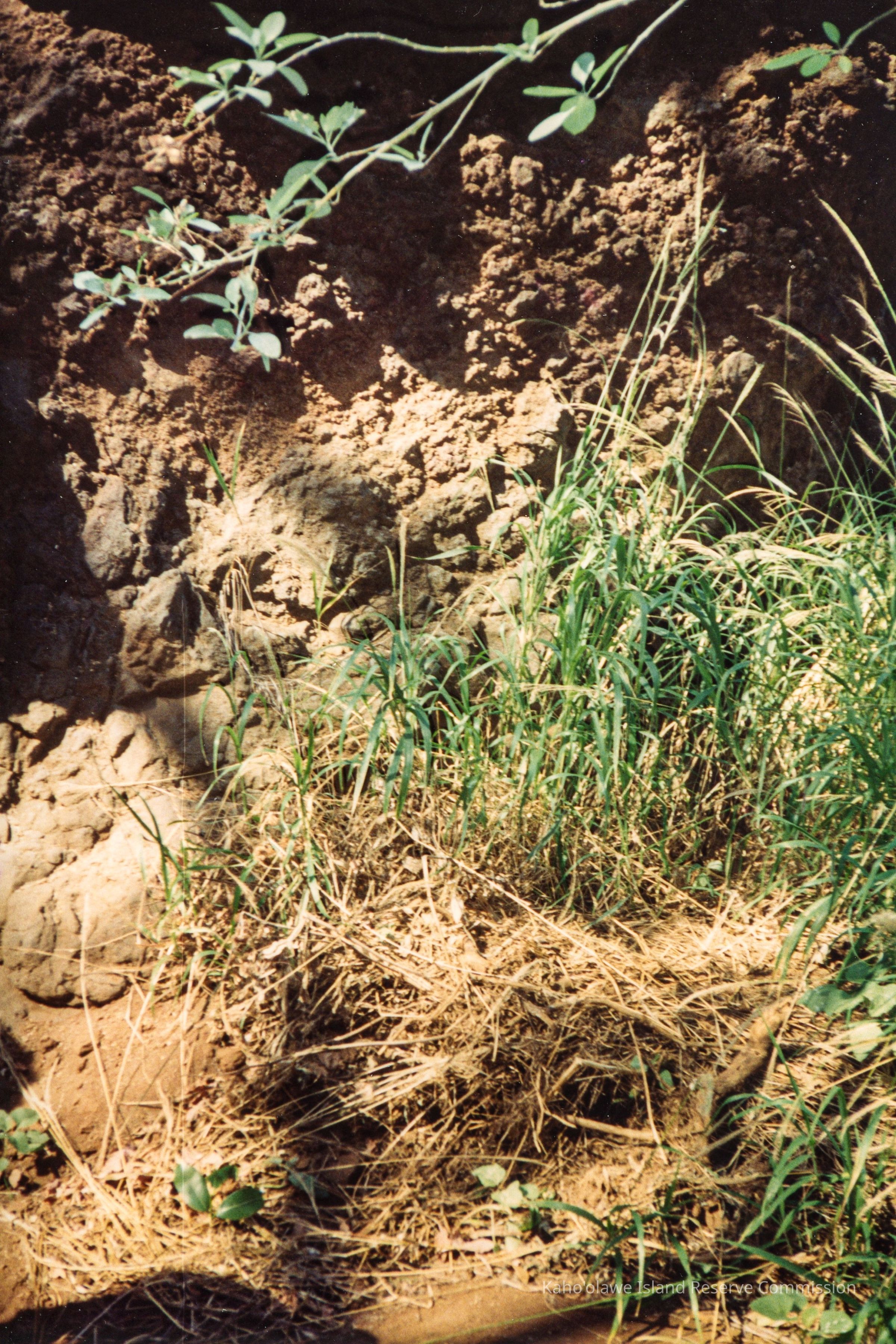 The image showcases a landscape with rocky, uneven terrain partially covered by wild grass and small green plants under sunlight.