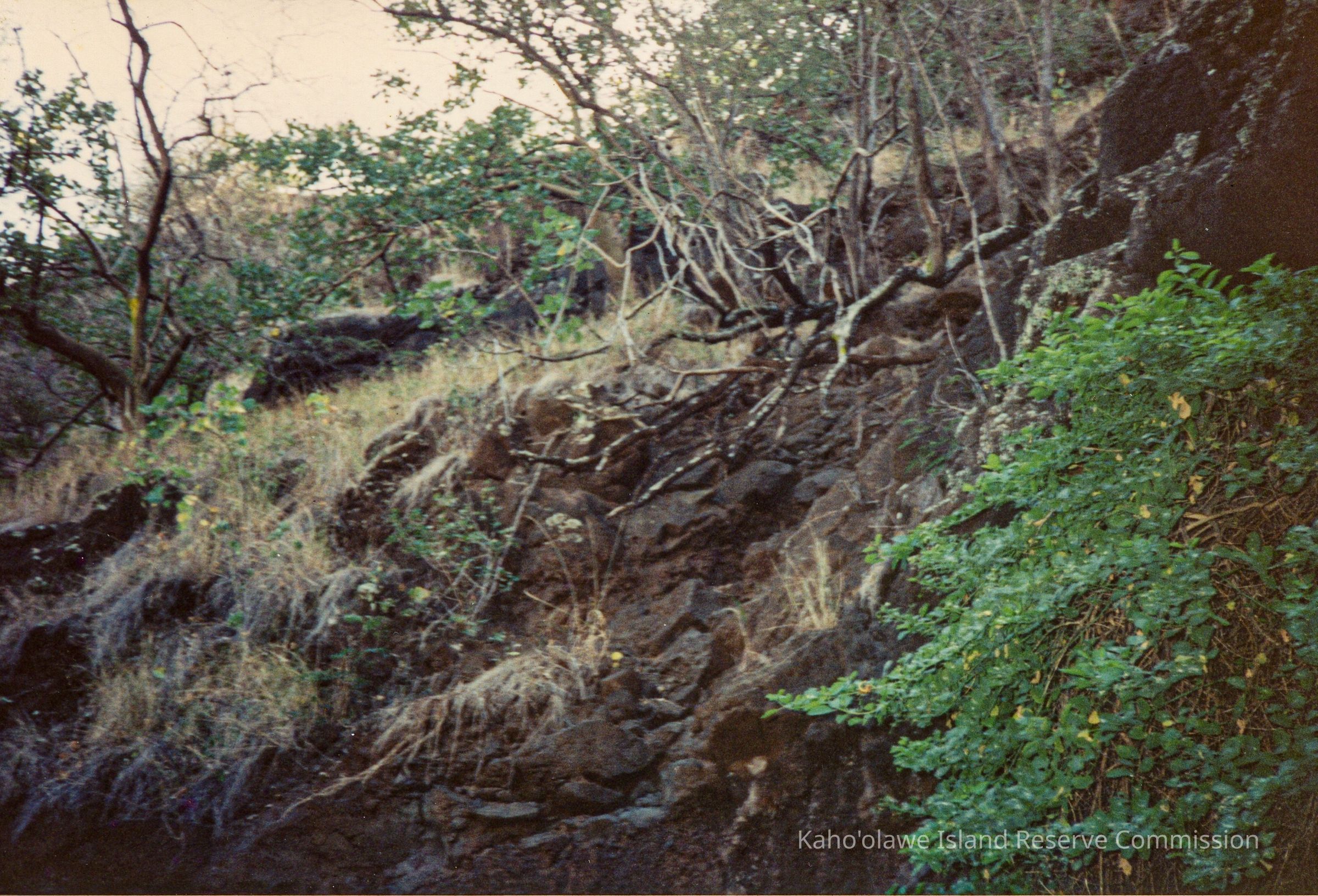 The image features a rocky hillside covered with sparse vegetation, including dry grass and green shrubs, amidst rugged terrain and scattered shrubs.