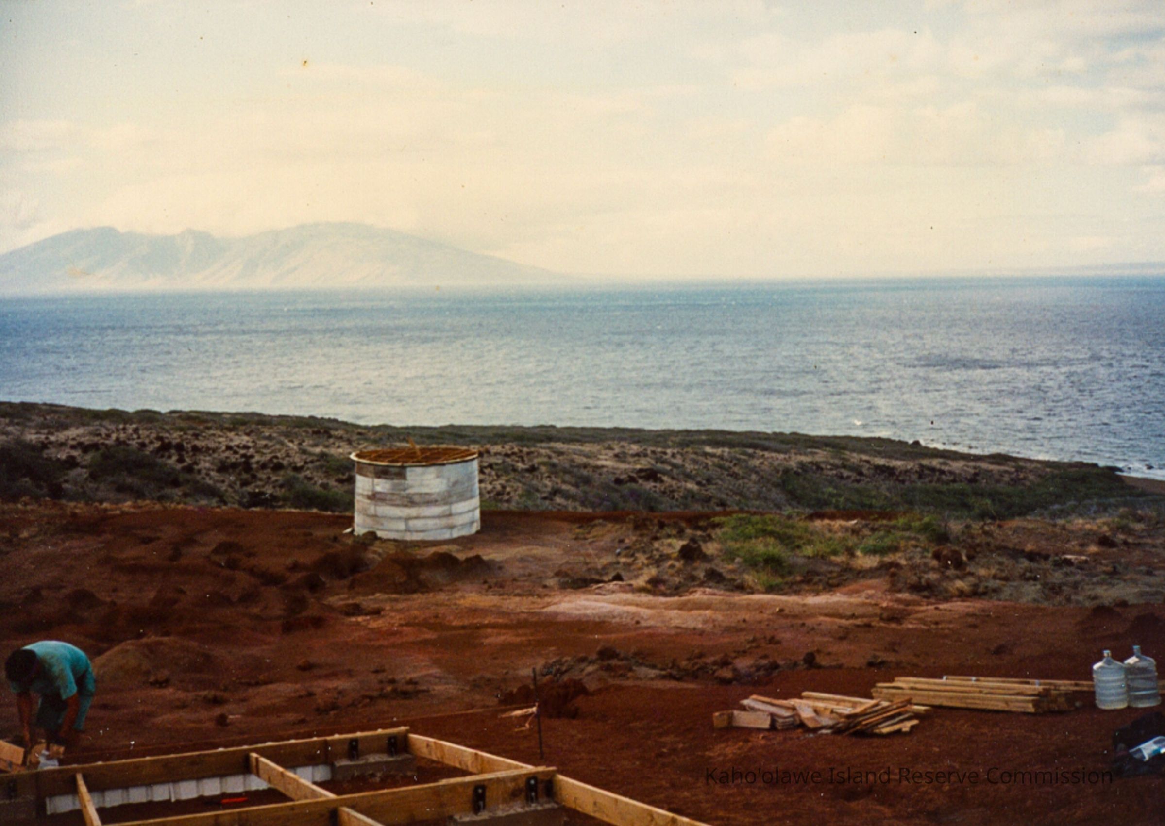 Color photograph of a cylindrical water tank in the distance on hardpan. There is a structural foundation for water catchment in the foreground with stacks of lumber and water bottles to the right.