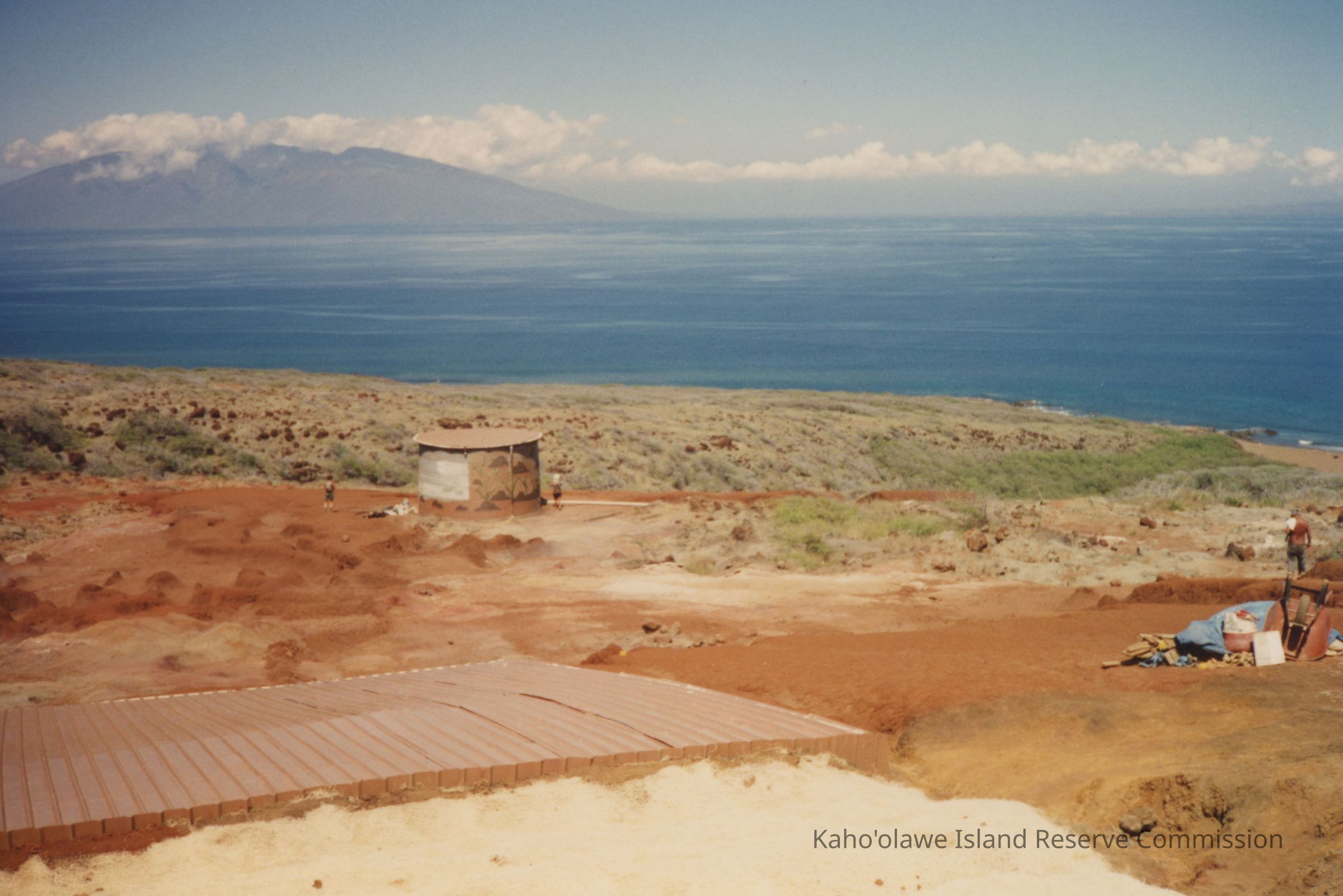 Color photograph of a water catchment structure and water tank taken from a distant view with two unidentified people standing near it and on person standing to the far right of it. Maui and the ocean are in the background.