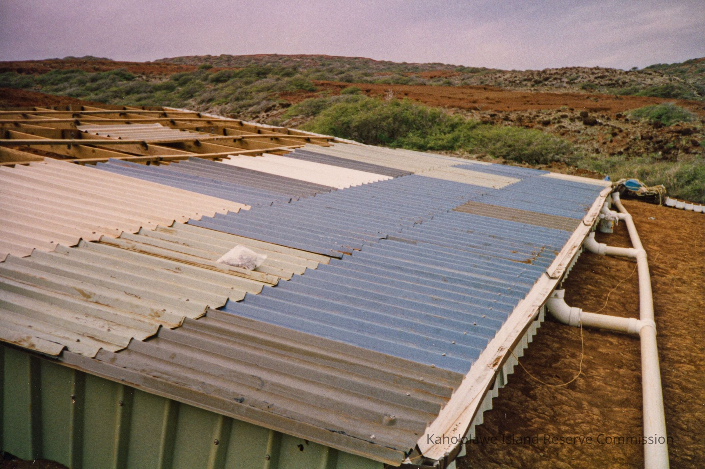 The image shows a water catchment structure with corrugated metal sheets and a network of pipes, set against an arid landscape background.