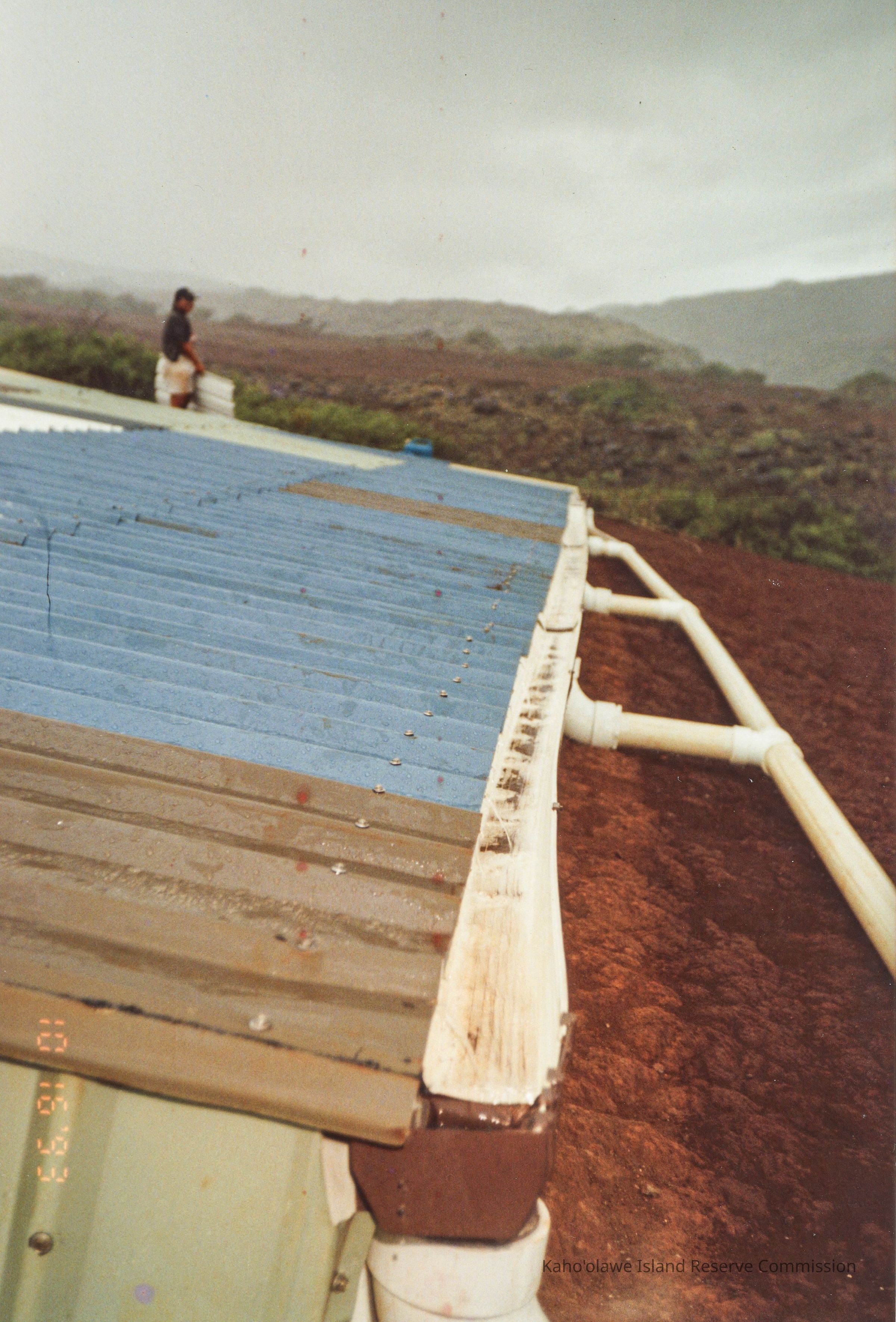 Color photograph of the edge of a water catchment structure with PVC (polyvinyl chloride) pipes connected to its sides. The structure is set on hardpan terrain. An unidentified person stands behind it in the far distance. This was taken when the first water being caught by the structure according to the handwritten text ("First Water Being Caught!") on the page in the original photo album.