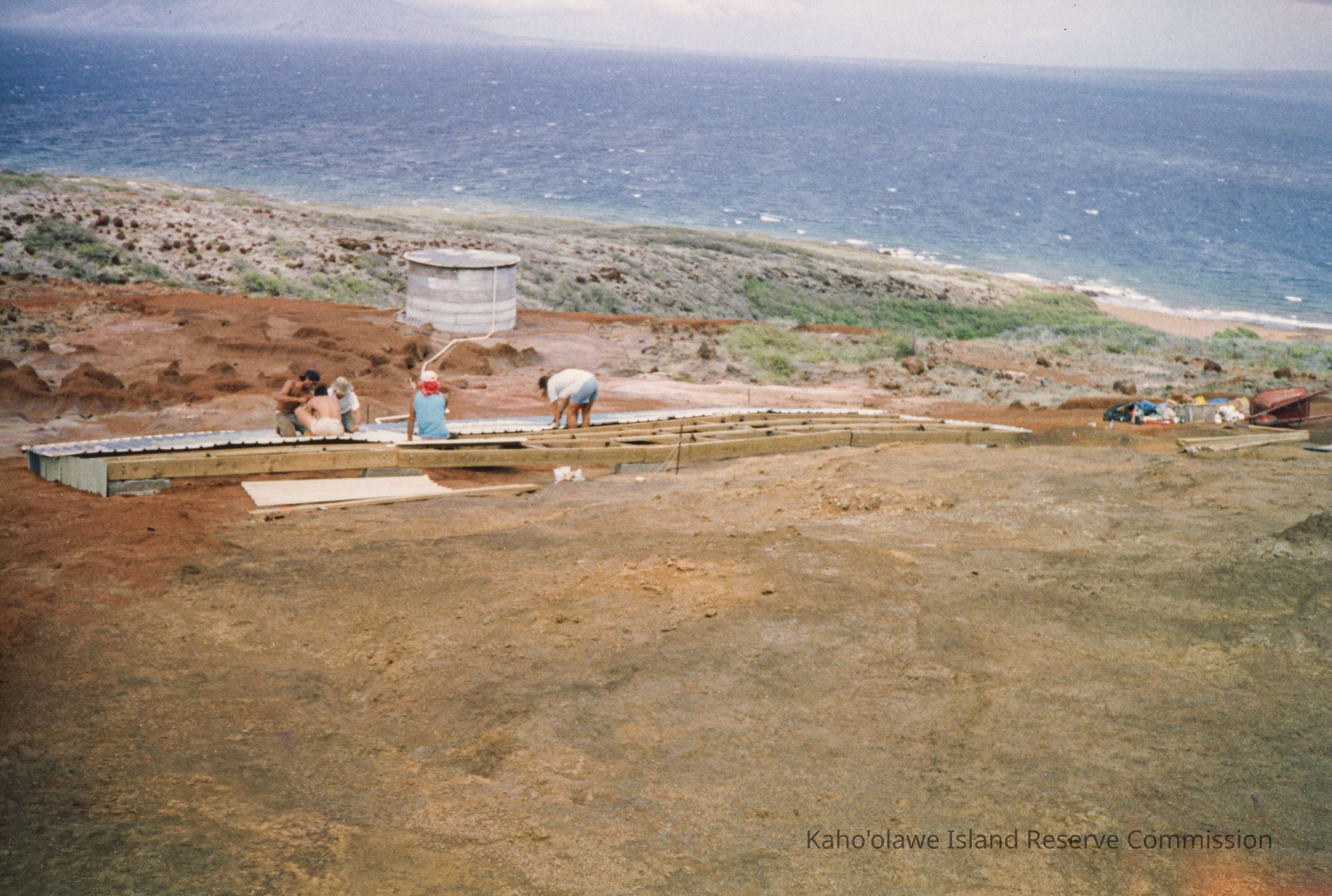 Several people are constructing a water catchment structure near the coast, with the ocean visible in the background.